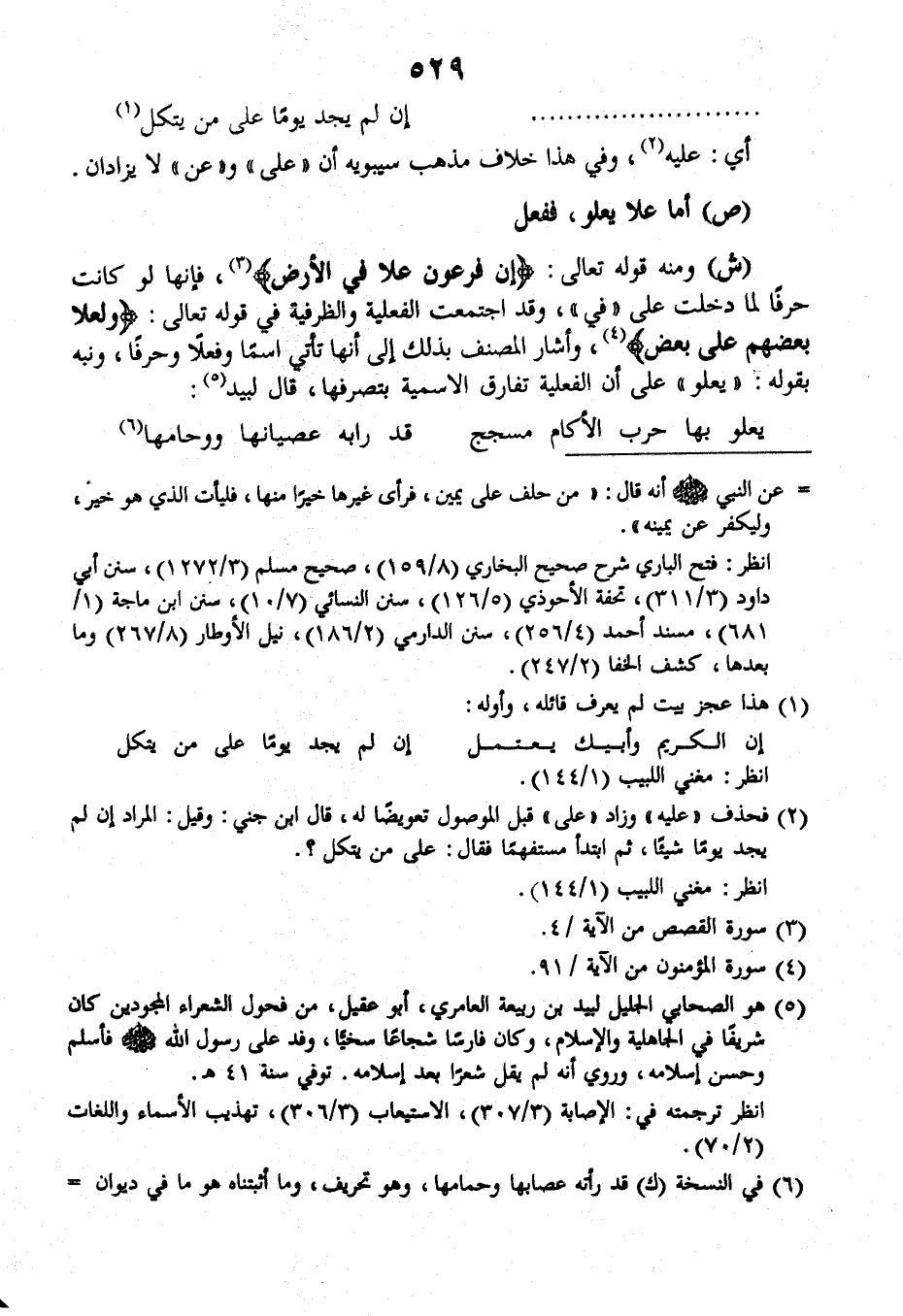 ش: ومنه قولُه تعالَى: {إِنَّ فِرْعَوْنَ عَلاَ فِي الأَرْضِ} فإنَّها لو كانَتْ حَرْفاً لمَّا دَخَلَتْ على (فِي) وقد اجْتَمَعَتْ الفِعْلِيَّةِ والظَّرْفِيَّةِ في قَوْلِهِ تعالَى: {وَلَعَلاَ بَعْضُهُمْ عَلَى بَعْضٍ} وأَشَارَ المصنِّفُ بذلك إلى أنَّها تَاتِي اسماً وفِعْلاً وحَرْفاً.