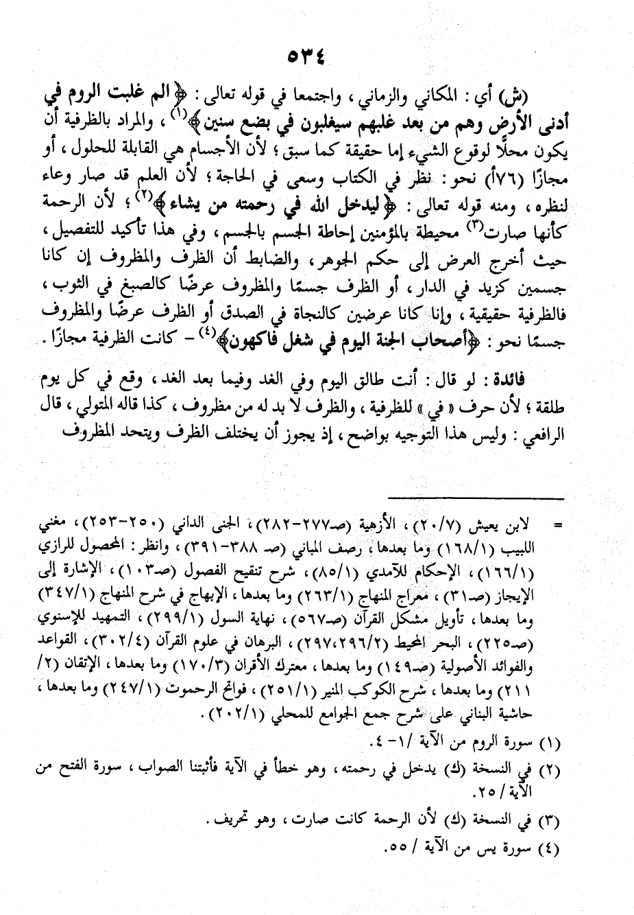 ش: أي: المَكَانِيُّ والزَّمَانِيُّ، واجْتَمْعَا في قَوْلِهِ تعالَى: {الم غُلِبَتْ الرُّومُ فِي أَدْنَى الأَرْضِ وَهُمْ مِنْ بَعْدِ غَلَبِهِمْ سَيَغْلِبُونَ فِي بِضْعِ سِنِينَ}. والمرادُ بالظرفِيَّةِ أنْ يَكُونَ مَحَلاًّ لوقوعِ الشَّيءِ إمَّا حقيقةٌ كما سَبَقَ؛ لأنَّ الأجْسامِ هي القابِلَةُ للحُلولِ، أو مَجازاً نحوَ: نَظَرَ في الكتابِ وسَعَى في الحاجَةِ؛ لأنَّ العَلَمَ قد صَارَ وِعَاءً لنَظَرِه، ومنه قولُه تعالَى: {لِيُدْخِلَ اللهُ فِي رَحْمَتِهِ مَنْ يَشَاءُ}؛ لأنَّ الرَّحْمَةَ كَأَنَّهَا صَارَتْ مُحِيطَةٌ بالمُؤْمِنِينَ إِحَاطَةَ الجِسْمِ بالجِسْمِ، وفي هذا تأكيدٌ للتفصيلِ، حيثُ أَخَرَجَ العَرَضَ إلى حُكْمِ الجَوْهَرِ، والضابطُ أنَّ الظَّرْفَ والمَظْرُوفَ إنْ كانَا جِسْمَيْنِ كزيدٍ في الدارِ، أو الظرفُ جسماً والمظروفُ عَرَضاً كالصَّبْغِ في الثوابِ، فالظَّرْفِيَّةِ حقيقةٌ، وإنْ كانا عَرَضَيْنِ كالنجاةِ في الصِّدْقِ أو الظَّرْفُ عَرَضاً والمظروفُ جِسْماً نحوَ: {أَصْحَابُ الْجَنَّةِ الْيَوْمَ فِي شُغْلٍ فَاكِهُونَ} كانَتِ الظَّرْفِيَّةِ مَجَازاً