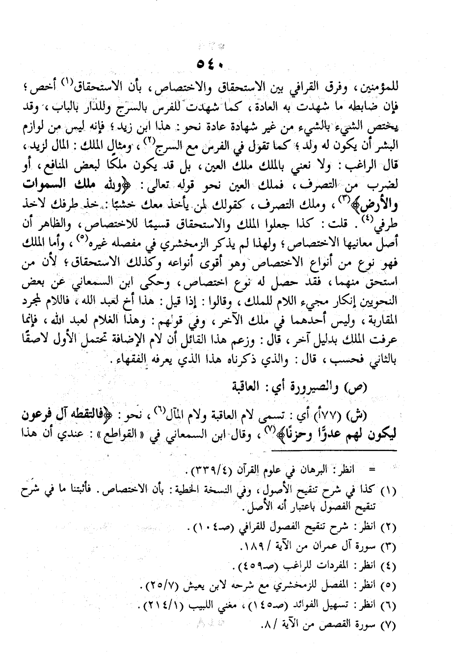 للمؤمنِينَ، وفَرَّقَ القِرَافِيُّ بينَ الاستحقاقِ والاختصاصِ، بأنَّ الاستحقاقَ أَخَصُّ، فإنَّ ضابطَه ما شَهِدَتْ به العادةُ، كما شَهِدَتْ للفَرَسِ بالسَّرْجِ وللدارِ بالبابِ، وقد يَخْتَصُّ الشيءُ بالشيءِ من غيرِ شهادةٍ عادةً، نحوَ: هذا ابنُ زيدٍ، فإنَّه ليسَ من لوازمِ البشرِ أنْ يكونَ له وَلَدٌ، كما تَقُولُ في الفَرَسِ معَ السَّرْجِ.