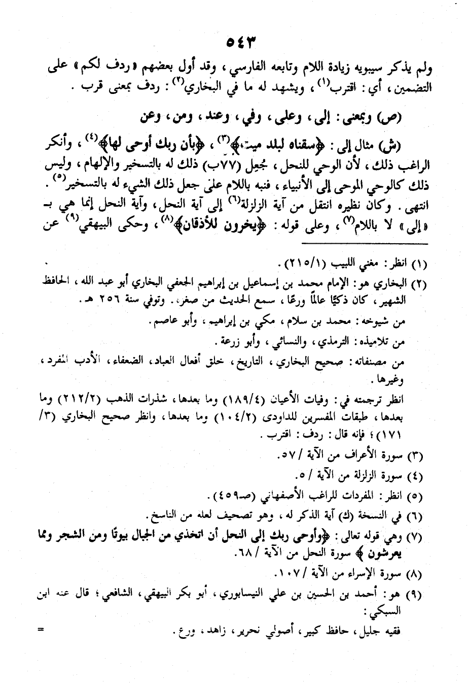 ش: مِثالُ إلَى: {سُقْنَاهُ لِبَلَدٍ مَيِّتٍ}، {بِأَنَّ رَبَّكَ أَوْحَى لَهَا}. وَأَنْكَرَ الرَّاغِبُ ذلكَ؛ لأنَّ الوَحْيَّ للنَّحْلِ، جَعَلَ ذلكَ لهُ بالتَّسْخِيرِ والإلْهَامِ، وليسَ ذلك كالوَّحْيِ المُوحَى إلى الأنْبياءِ، فنَبَّهَ باللاَّمِ على جَعْلِ ذلكَ الشيءِ لهُ بالتَّسْخِيرِ. انتهى.