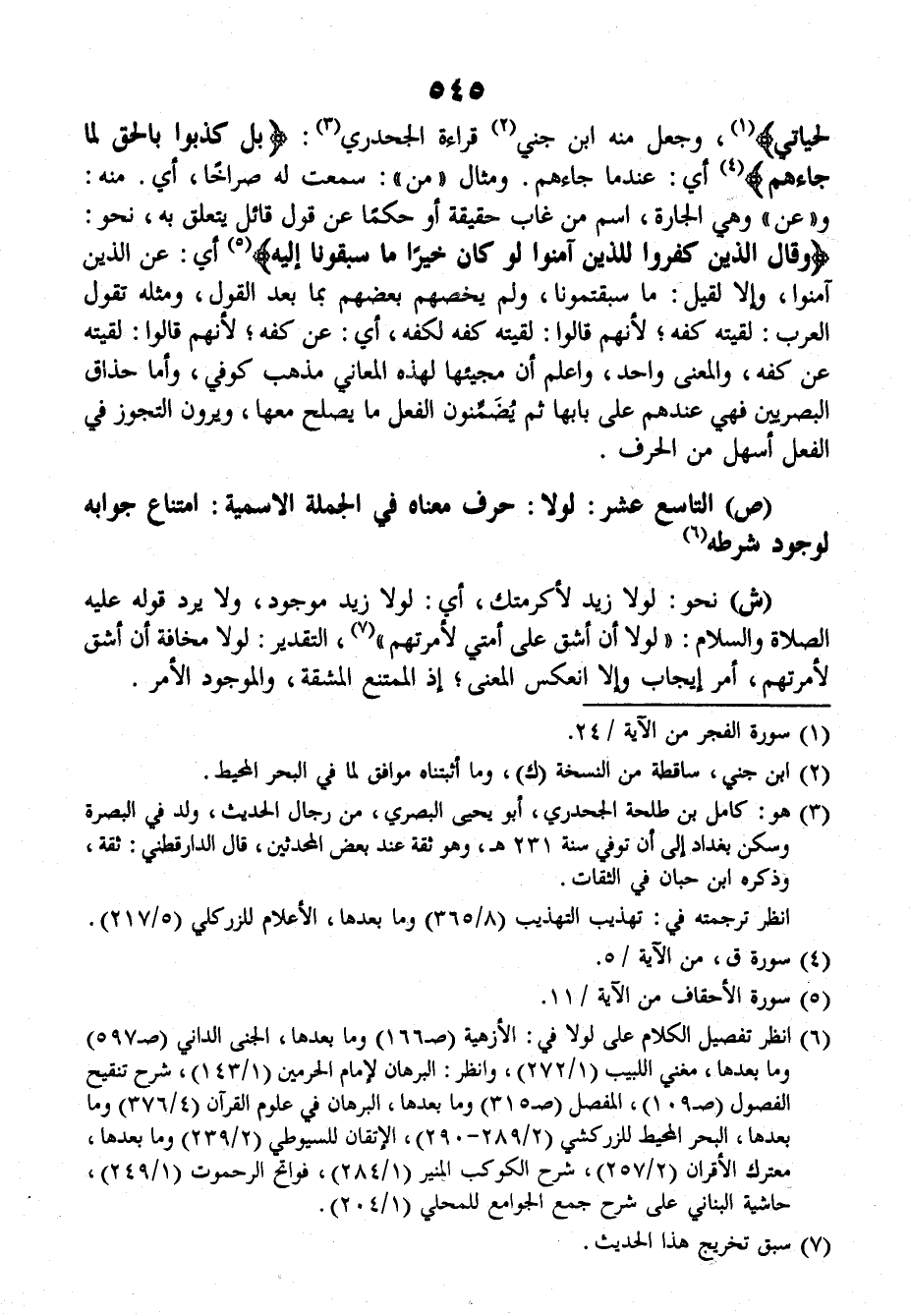 ص: التاسعَ عَشَرَ: لولاَ: حَرْفٌ معناهُ في الجُمْلَةِ الاسمِيَّةِ: امْتِنَاعُ جَوابِه لوُجودِ شَرْطِه.