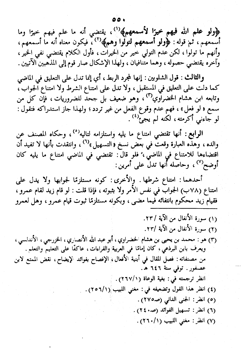 {وَلَوْ عَلِمَ اللهُ فِيهِمْ خَيْراً لأَسْمَعَهُمْؤ} يَقْتَضِيِ أَنَّه مَا عَلِمَ فيهِم خيراً وما أَسْمَعَهُم، ثمَّ قولُه: {وَلَوْ أَسْمَعَهُمْ لَتَوَلَّوْا وَهُمْ} فيَكُونُ معناهُ أنَّه ما أَسْمَعَهُم، وأنَّهم ما تَوَلَّوْا، لكنْ عَدَمُ التَّوَلِّي خَيْرٌ من الخَيْرَاتِ، فأوَّلُ الكلامِ يَقْتَضِي نَفْيَ الخَيْرِ، وآخِرُه يَقْتَضِي حصولَه، وهما مُتَنَافِيَانِ ولهذا الإشكالُ صَارَ قومٌ إلى المَذْهَبَيْنِ الآتِيَيْنِ:
