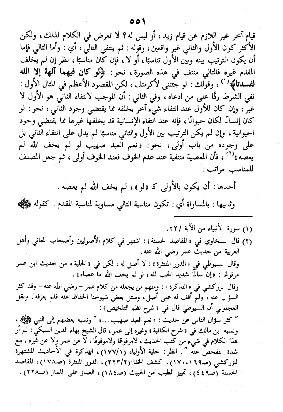 قيامٌ آخَرَ غيرُ اللاَّزمِ عن قيامِ زيدٍ، أو ليسَ له؟ لا تَعَرُّضَ في الكلامِ لذلك، ولكنَّ الأكْثَرَ كونُ الأوَّلِ والثاني غيرَ واقِعَيْنِ، وقولُه: ثمَّ يَنْتَفِي التالِي؛ أي: وأَمَّا التالِي فإمَّا أنْ يَكُونَ التَّرْتِيبُ بَيْنَه وبَيْنَ الأوَّلِ تَنَاسُباً، أو لا، فإنْ كانَ مُنَاسِباً نُظِرَ إنْ لم يَخْلُفِ المُقَدَّمُ غيرَه فالتالِي مُنْتَفٍ في هذه الصورةِ، نحوَ: {لَوْ كَانَ فِيهِمَا آلِهَةٌ إِلاَّ اللهَ لَفَسَدَتَا}. وقولُك: لو جِئتَنِي لأَكْرَمْتُكَ، لكنَّ المقصودَ الأعظمَ في المثالِ الأوَّلِ: نَفْيُ الشَّرْطِ رَدًّا على مَن ادَّعَاهُ، وفي الثاني: أنَّ المُوجِبَ لانْتِفاءِ الثاني هو الأوَّلُ لا غيرَ، وإنْ كانَ للأوَّلِ عندَ انتفاءِ شيءٍ آخَرَ يَخْلُفُه ممَّا يَقْتَضِي وجودَ الثانِي نحوَ: لو كانَ إنساناً لكانَ حيواناً، فإنَّه عندَ انتفاءِ الإنْسانِيَّةِ قد يَخْلُفُها غيرُها ممَّا يَقْتَضِي وجودَ الحيوانِيَّةِ، وإنْ لم يكنِ الترتيبُ بينَ الأوَّلِ والثانِي مُنَاسِباً لم يَدُلُّ على انتفاءِ الثاني بل على وجودِه من بابِ أَوْلَى، نحوَ: ((نِعْمَ العَبْدُ صُهَيْبٍ لَوْ لَمْ يَخَفِ اللهَ لَمْ يَعْصِهِ)). فإنَّ المَعْصِيَةَ مُنْتَفِيَةٌ عندَ عَدَمِ الخوفِ فعِنْدَ الخوفِ أوْلَى، ثمَّ جَعَلَ المُصَنِّفُ للمُناسِبِ مَراتِبَ: