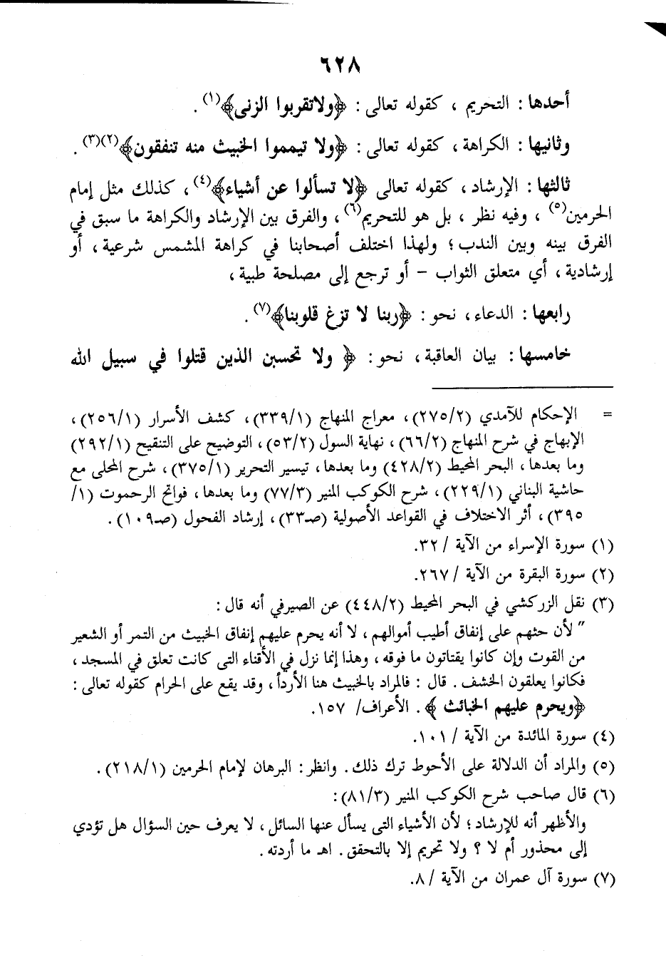 ثالثها: الإرشاد، كقوله تعالى: {لا تسألوا عن أشياء} كذلك مثل إمام الحرمين وفيه نظر بل هو للتحريم والفرق بين الإرشاد والكراهة ما سبق في الفرق بينه وبين الندب، ولهذا اختلف أصحابنا في كراهة المشمس شرعية، أو إرشادية أي متعلق الثواب - أو ترجع إلى مصلحة طبية.