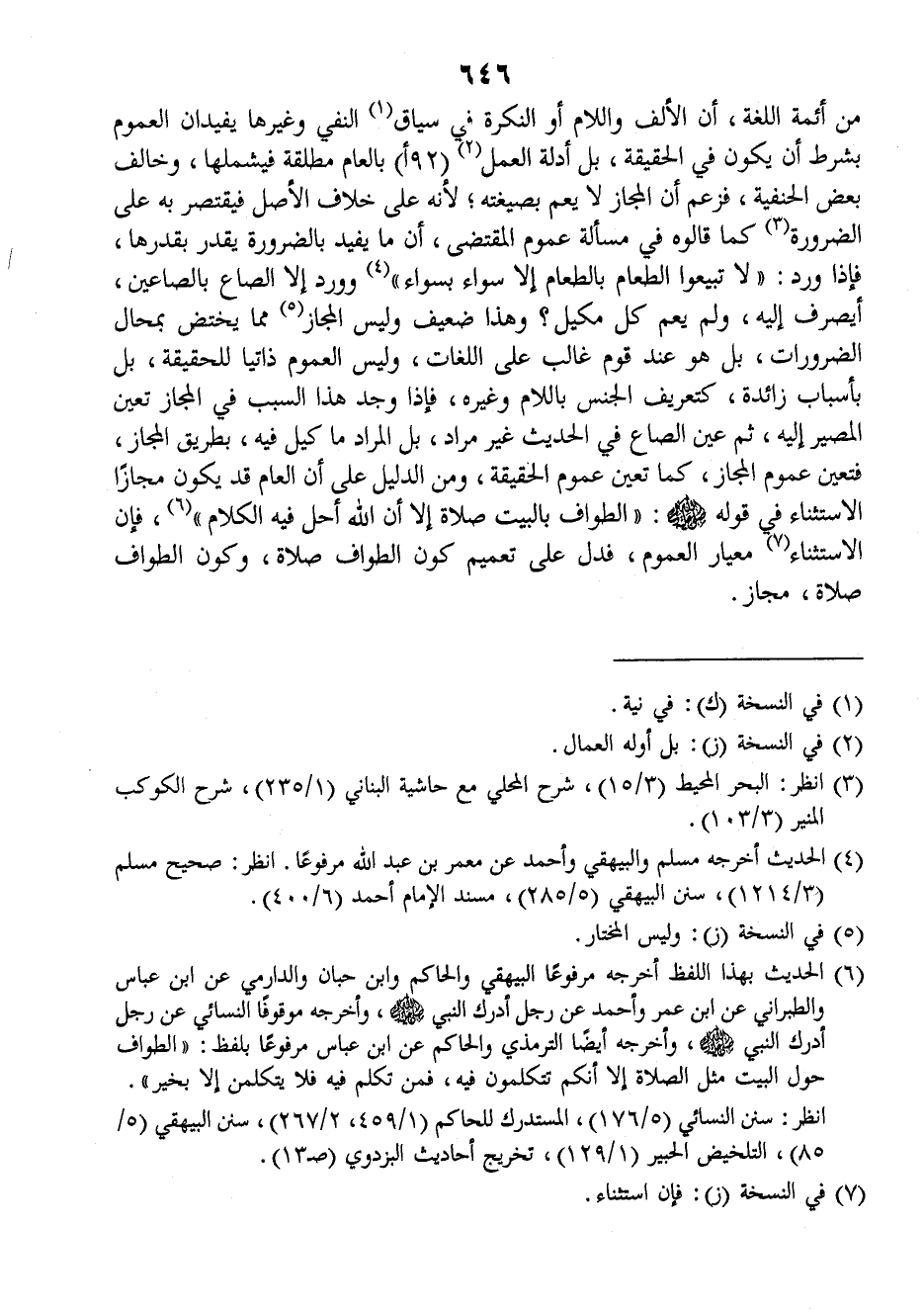 من أئمة اللغة، أن الألف واللام أو النكرة في سياق النفي وغيرها يفيدان العموم بشرط أن يكون في الحقيقة بل أدلة العمل (٩٢أ) بالعام مطلقة فيشملها وخالف بعض الحنفية فزعم أن المجاز لا يعم بصيغته لأنه على خلاف الأصل فيقتصر به على الضرورة كما قالوه في مسألة عموم المقتضى، أن ما يفيد بالضرورة يقدر بقدرها فإذا ورد: ((لا تبيعوا الطعام بالطعام، إلا سواء بسواء)). وورد إلا الصاع بالصاعين، أيصرف إليه، ولم يعم كل مكيل؟ وهذا ضعيف وليس المجاز مما يختص بمحال الضرورات بل هو عند قوم غالب على اللغات وليس العموم ذاتيا للحقيقة بل بأسباب زائدة كتعريف الجنس باللام وغيره، فإذا وجد هذا السبب في المجاز تعين المصير إليه، ثم عين الصاع في الحديث غير مراد، بل المراد ما كيل فيه، بطريق المجاز فتعين عموم المجاز، كما تعين عموم الحقيقة، ومن الدليل على أن العام قد يكون مجازا الاستثناء في قوله صلى الله عليه وسلم: ((الطواف بالبيت صلاة إلا أن الله أحل فيه الكلام)). فإن الاستثناء معيار العموم، فدل على تعميم كون الطواف صلاة، وكون الطواف صلاة. مجاز.
