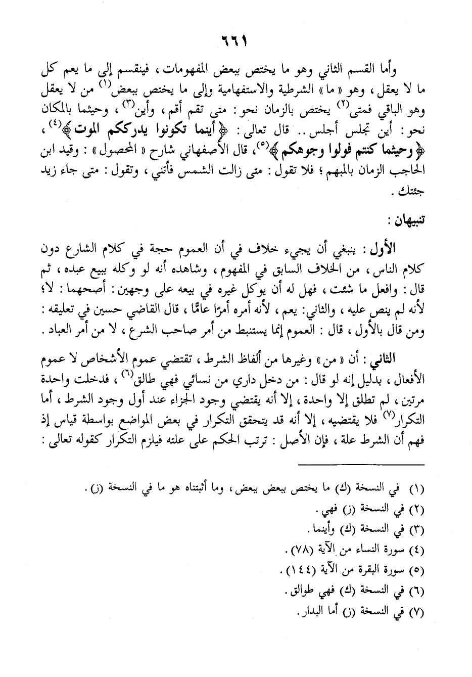 وأما القسم الثاني وهو ما يختص ببعض المفهومات فينقسم إلى ما يعم كل ما لا يعقل، وهو (ما) الشرطية والاستفهامية، وإلى ما يختص ببعض من لا يعقل وهو الباقي فمتى يختص بالزمان نحو: متى تقم أقم، وأين وحيثما بالمكان نحو: أين تجلس أجلس ... قال تعالى: {أينما تكونوا يدرككم الموت}. {وحيثما كنتم فولوا وجوهكم} قال الأصفهاني شارح (المحصول): وقيد ابن الحاجب الزمان بالمبهم فلا تقول: متى زالت الشمس فأتني، وتقول: متى جاء زيد جئتك.