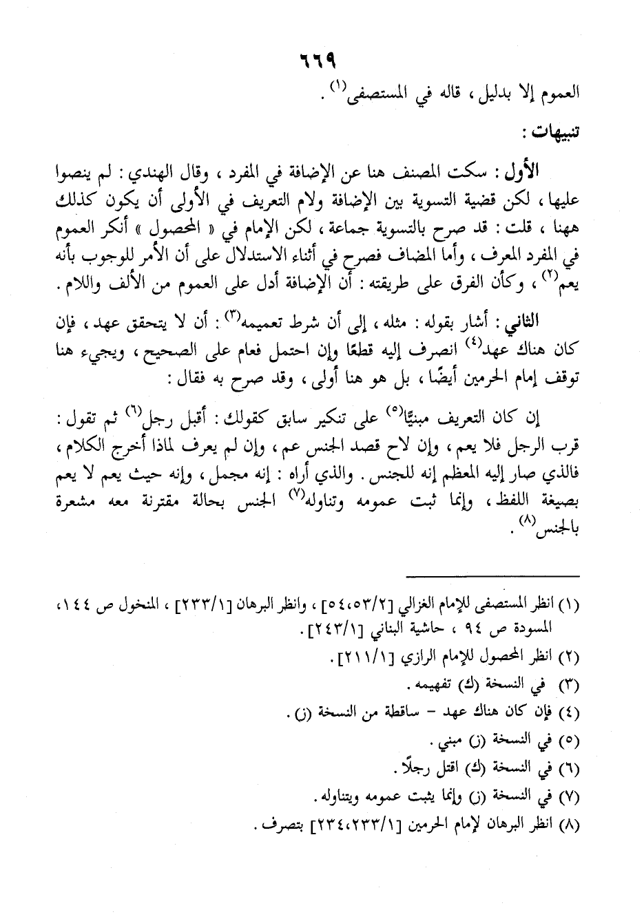 الأول: سكت المصنف هنا عن الإضافة في المفرد، وقال الهندي: لم ينصوا عليها لكن قضية التسوية بين الإضافة ولام التعريف في الأولى أن يكون كذلك ههنا، قلت: قد صرح بالتسوية جماعة، لكن الإمام في (المحصول) أنكر العموم في المفرد المعرف، وأما المضاف فصرح في أثناء الاستدلال على أن الأمر للوجوب بأنه يعم وكأن الفرق على طريقته: أن الإضافة أدل على العموم من الألف واللام.