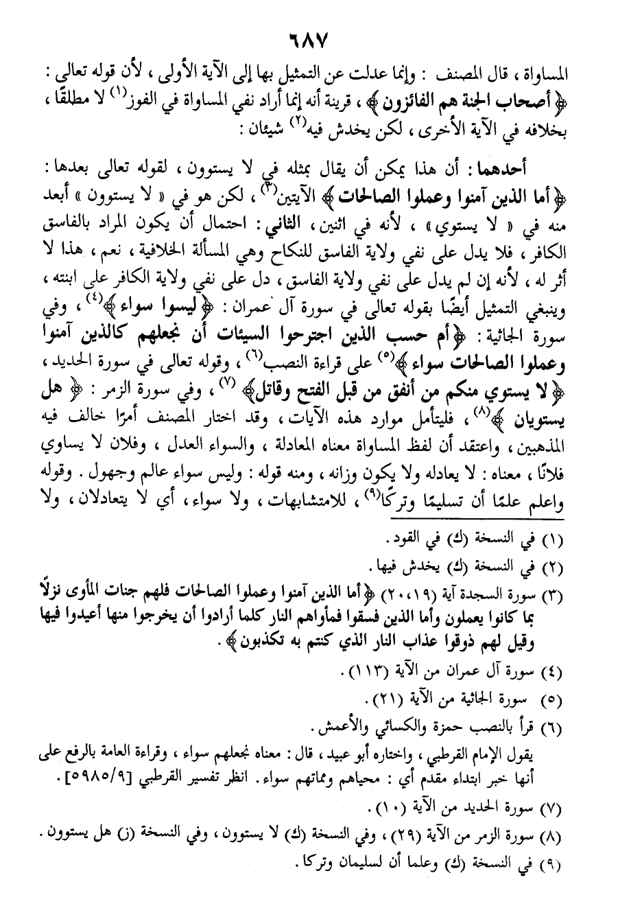 أحدهما: أن هذا يمكن أن يقال بمثله في لا يستوون لقوله تعالى بعدها: {أما الذين آمنوا وعملوا الصالحات} الآيتين لكن هو في (لا يستوون) أبعد منه في (لا يستوي) لأنه في اثنين، الثاني: احتمال أن يكون المراد بالفاسق الكافر، فلا يدل على نفي ولاية الفاسق للنكاح وهي المسألة الخلافية نعم، هذا لا أثر له لأنه إن لم يدل على نفي ولاية الفاسق دل على نفي ولاية الكافر على ابنته وينبغي التمثيل أيضا بقوله تعالى في سورة آل عمران {ليسوا سواء} وفي سورة الجاثية: {أم حسب الذين اجترحوا السيئات أن نجعلهم كالذين آمنوا وعملوا الصالحات سواء} على قراءة النصب وقوله تعالى في سورة الحديد {لا يستوي منكم من أنفق من قبل الفتح وقاتل} وفي سورة الزمر: {هل يستويان} فليتأمل موارد هذه الآيات، وقد اختار المصنف أمرا خالف فيه المذهبين، واعتقد أن لفظ المساواة معناه المعادلة، والسواء العدل، وفلان لا يساوي فلانا، معناه: لا يعادله ولا يكون وزانه، ومنه قوله: وليس سواء عالم وجهول. وقوله واعلم علما أن تسليما وتركا للامتشابهات، ولا سواء أي لا يتعادلان ولا