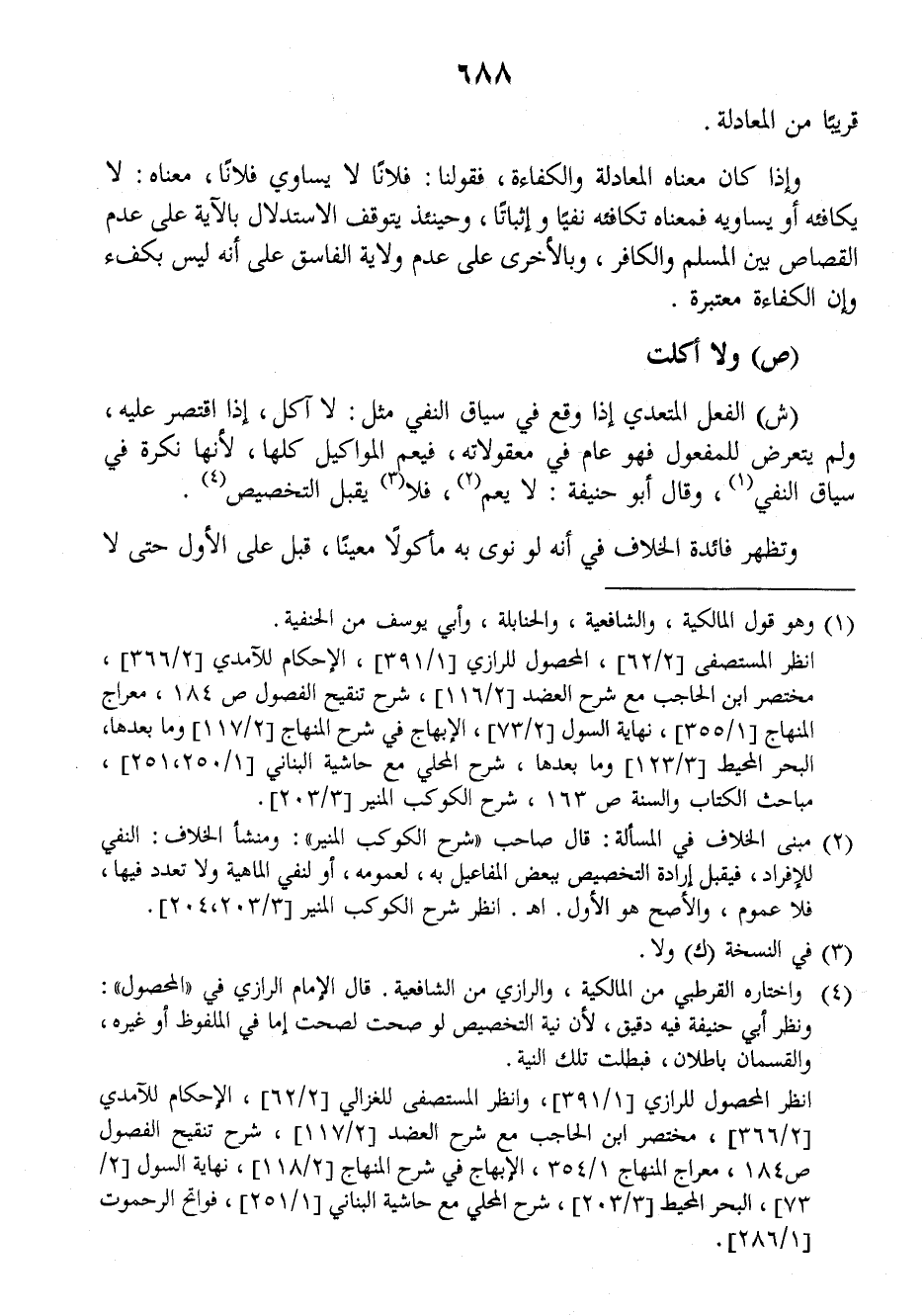 (ش) الفعل المتعدي إذا وقع في سياق النفي مثل: لا آكل إذا اقتصر عليه، ولم يتعرض للمفعول فهو عام في معقولاته، فيعم المواكيل كلها، لأنها نكرة في سياق النفي وقال أبو حنيفة: لا يعم فلا يقبل التخصيص.