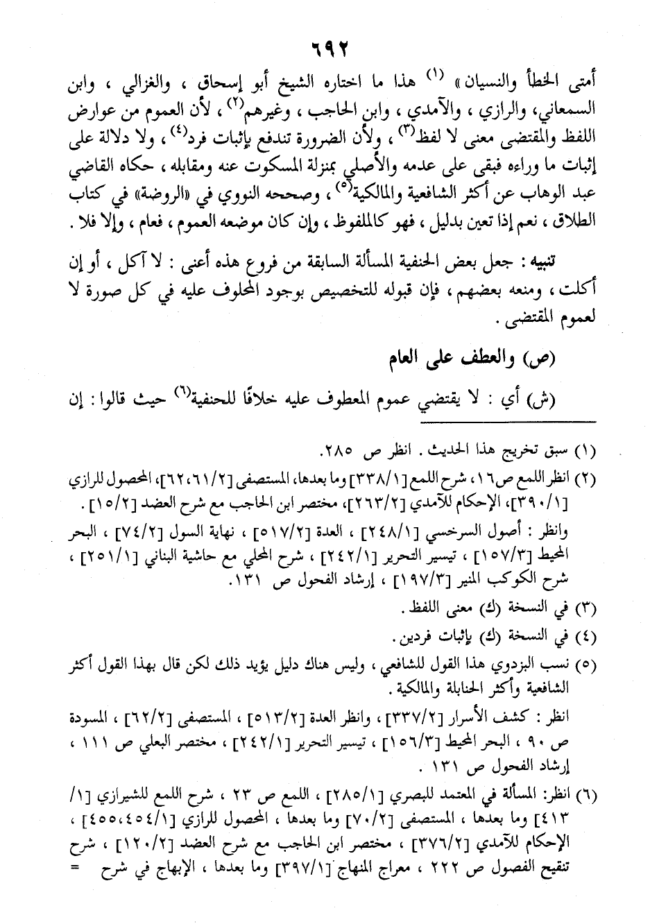 (ش) أي: لا يقتضي عموم المعطوف عليه خلافا للحنفية حيث قالوا: إن