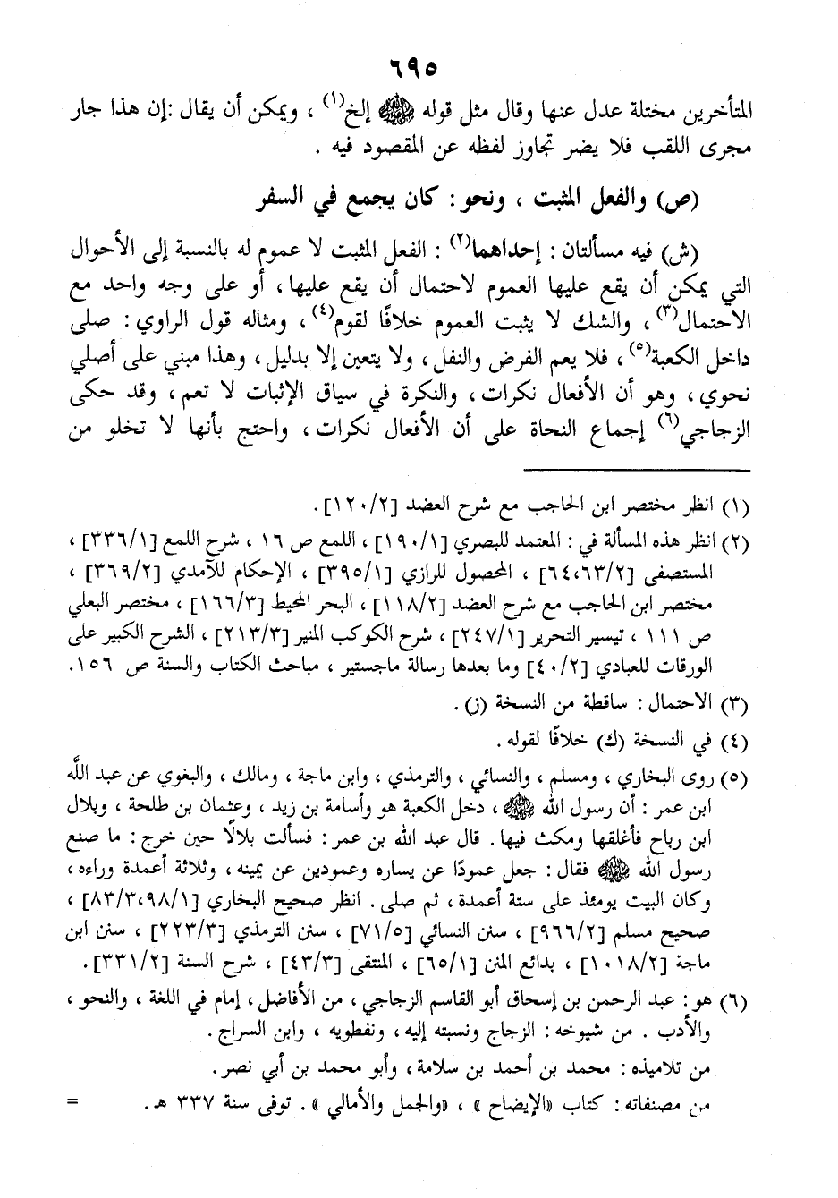 (ش) فيه مسألتان: إحداهما: الفعل المثبت لا عموم له بالنسبة إلى الأحوال التي يمكن أن يقع عليها العموم لاحتمال أن يقع عليها أو على وجه واحد مع الاحتمال والشك لا يثبت العموم خلافا لقوم ومثاله قول الراوي: صلى داخل الكعبة، فلا يعم الفرض والنفل ولا يتعين إلا بدليل وهذا مبني على أصلي نحوي، وهو أن الأفعال نكرات والنكرة في سياق الإثبات لا تعم، وقد حكى الزجاجي إجماع النحاة على أن الأفعال نكرات، واحتج بأنها لا تخلو من