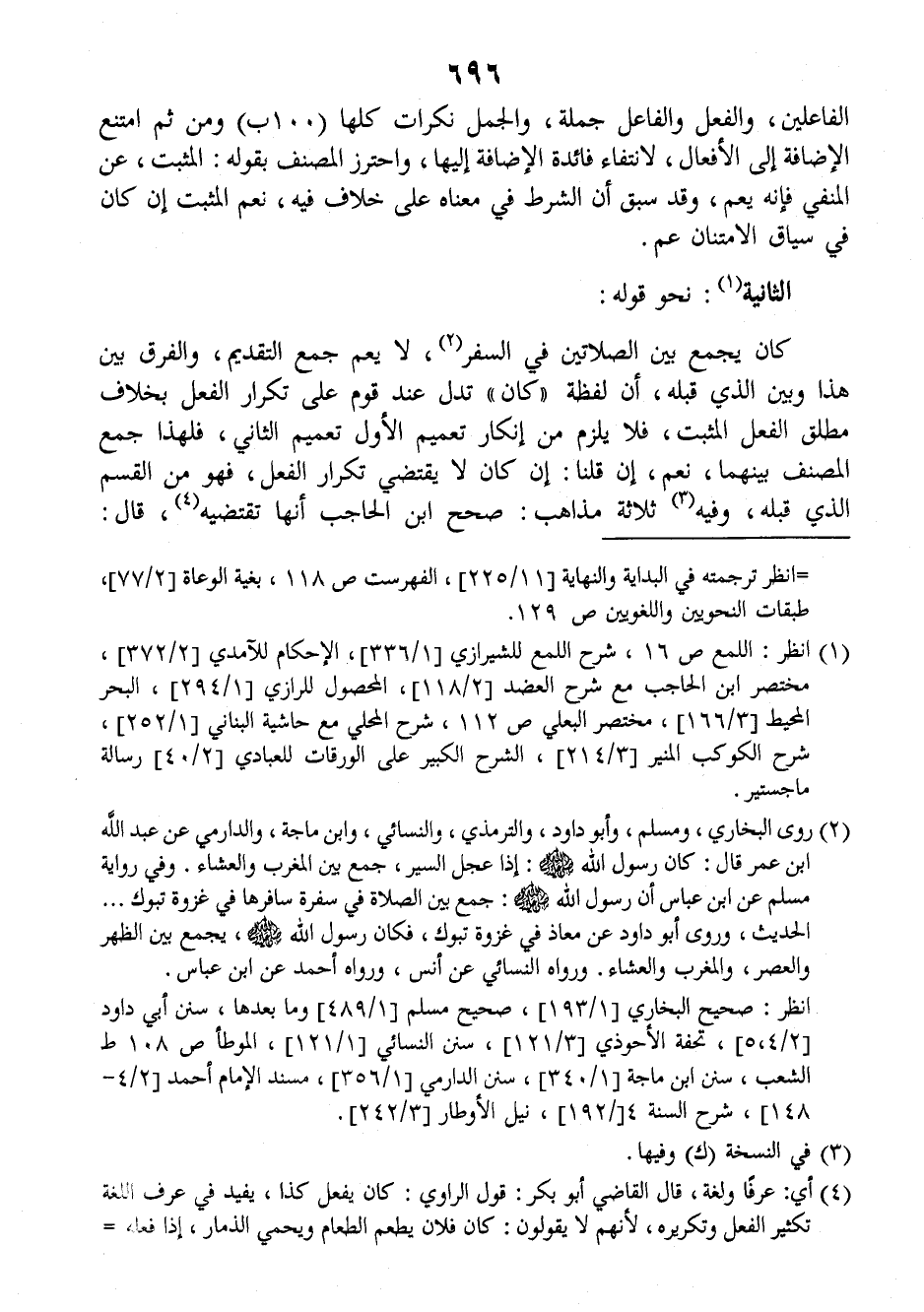كان يجمع بين الصلاتين في السفر لا يعم جمع التقديم والفرق بين هذا وبين الذي قبله، أن لفظة (كان) تدل عند قوم على تكرار الفعل بخلاف مطلق الفعل المثبت فلا يلزم من إنكار تعميم الأول تعميم الثاني، فلهذا جمع المصنف بينهما، نعم، إن قلنا: إن كان لا يقتضي تكرار الفعل، فهو من القسم الذي قبله وفيه ثلاثة مذاهب: صحح ابن الحاجب أنها تقتضيه قال: