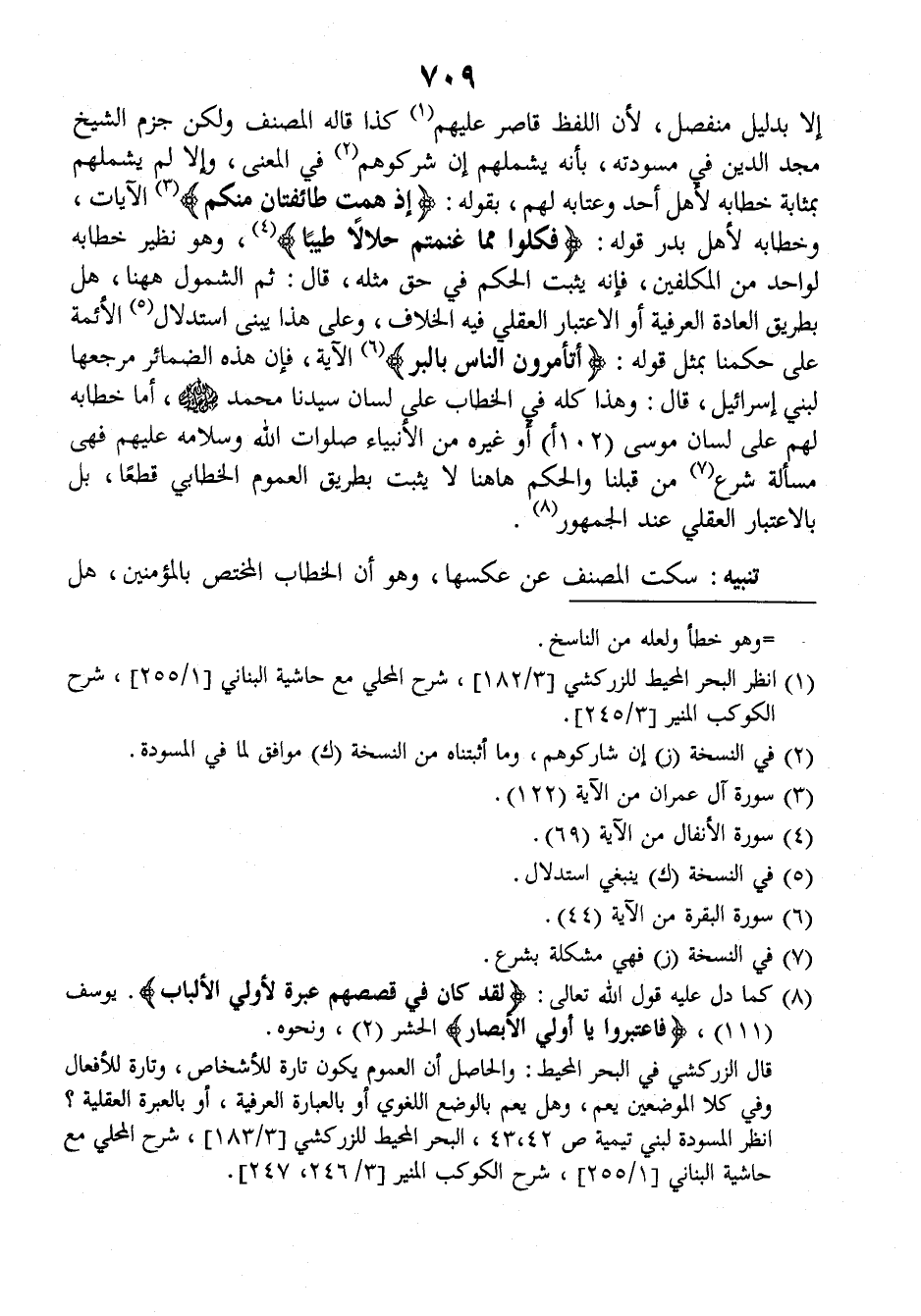 إلا بدليل منفصل، لأن اللفظ قاصر عليهم كذا قاله المصنف ولكن جزم الشيخ مجد الدين في مسودته، بأنه يشملهم إن شركوهم في المعنى، وإلا لم يشملهم بمثابة خطابه لأهل أحد وعتابه لهم بقوله: {إذ همت طائفتان منكم} الآيات وخطابه لأهل بدر قوله: {فكلوا مما غنمتم حلالا طيبا} وهو نظير خطابه لواحد من المكلفين: فإنه يثبت الحكم في حقه مثله قال: ثم الشمول ههنا، هل بطريق العادة العرفية أو الاعتبار العقلي فيه الخلاف، وعلى هذا يبنى استدلال الأئمة على حكمنا بمثل قوله: {أتأمرون الناس بالبر} الآية، فإن هذه الضمائر مرجعها لبني إسرائيل قال: وهذا كله في الخطاب على لسان سيدنا محمد صلى الله عليه وسلم أما خطابه لهم على لسان موسى (١٠٢أ) أو غيره من الأنبياء صلوات الله وسلامه عليهم فهي مسألة شرع من قبلنا والحكم ههنا لا يثبت بطريق العموم الخطابي قطعا، بل بالاعتبار العقلي عند الجمهور.