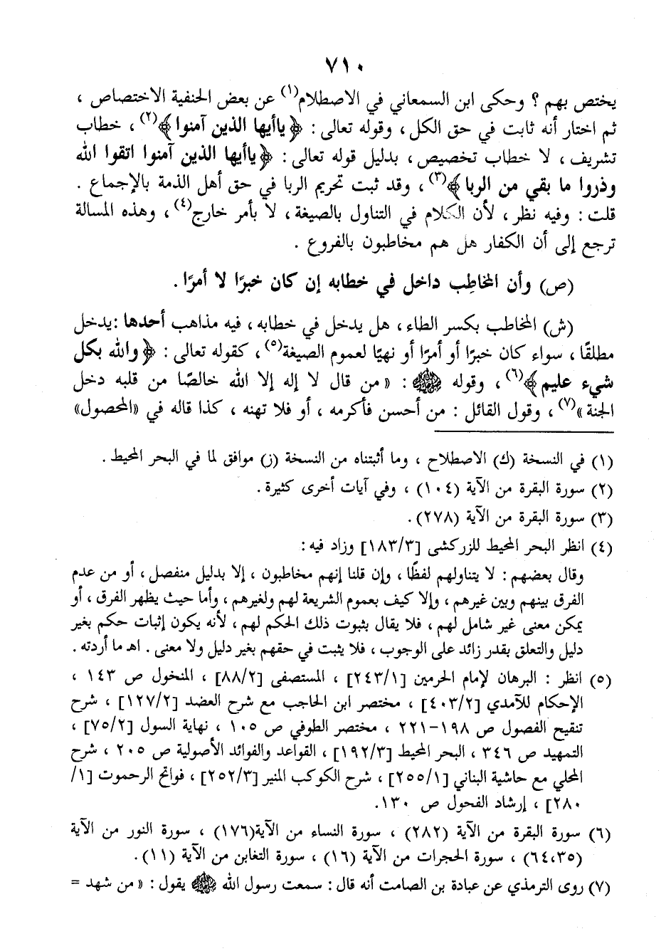 يختص بهم؟ وحكى ابن السمعاني في الاصطلام عن بعض الحنفية الاختصاص ثم اختار أنه ثابت في حق الكل، وقوله تعالى: {يا أيها الذين آمنوا} خطاب تشريف لا خطاب تخصيص، بدليل قوله تعالى: {يا أيها الذين آمنوا اتقوا لله وذروا ما بقي من الربا} وقد ثبت تحريم الربا في حق أهل الذمة بالإجماع، قلت: وفيه نظر، لأن الكلام في التناول بالصيغة، لا بأمر خارج وهذه المسألة ترجع إلى أن الكفار هل هم مخاطبون بالفروع.