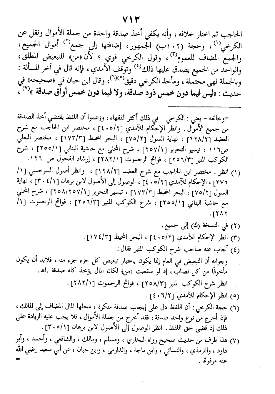 الحاجب ثم اختار خلافه، وأنه يكفي أخذ صدقة واحدة من جملة الأموال ونقل عن الكرخي وحجة (١٠٢ب) الجمهور، إضافتها إلى جمع أموال الجميع والجمع المضاف للعموم، وقول الكرخي قوي، لأن (من) للتبعيض المطلق والواحد من الجميع يصدق عليها ذلك وتوقف الآمدي فإنه قال في آخر المسألة: وبالجملة فهي محتملة، ومأخذ الكرخي دقيق وقال ابن حبان في (صحيحه) في حديث: ((ليس فيما دون خمس ذود صدقة، ولا فيما دون خمس أواق صدقة)).