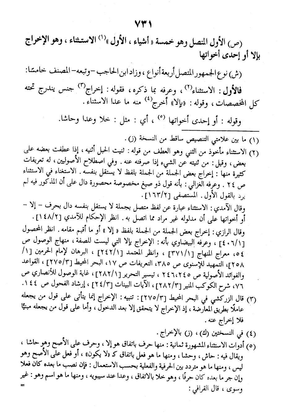 (ص) الأول المتصل وهو خمسة (أشياء الأول) الاستثناء وهو الإخراج بإلا أو إحدى أخواتها.