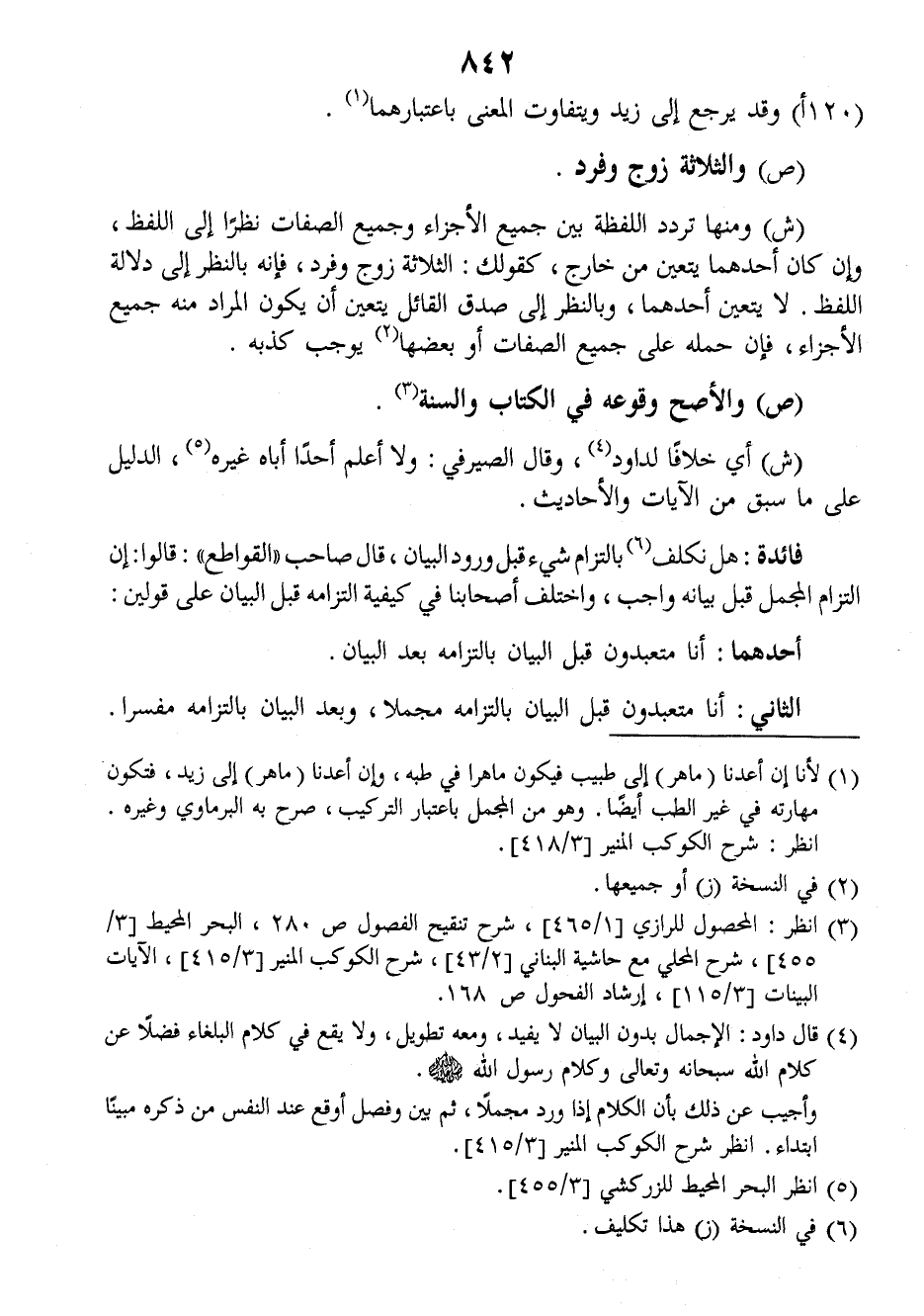 (ش) ومنها تردد اللفظة بين جميع الأجزاء وجميع الصفات نظرا إلى اللفظ وإن كان أحدهما يتعين من خارج، كقولك: الثلاثة زوج وفرد، فإنه بالنظر إلى دلالة اللفظ. لا يتعين أحدهما، وبالنظر إلى صدق القائل يتعين أن يكون المراد منه جميع الأجزاء فإن حمله على جميع الصفات أو بعضها يوجب كذبه.