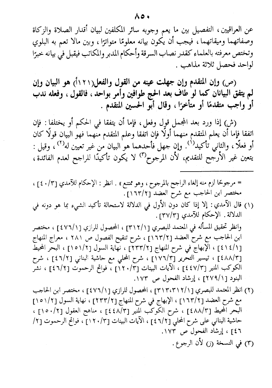 (ش) إذا ورد بعد المجمل قول وفعل، فإما أن يتفقا في الحكم أو يختلفا: فإن اتفقا فإما أن يعلم المتقدم منهما أولا فإن اتفقا وعلم المتقدم منهما فهو البيان قولا كان أو فعلا، والثاني تأكيد وإن جهل فأحدهما هو البيان من غير تعيين له، وقيل: يتعين غير الأرجح للتقديم، لأن المرجوح، لا يكون تأكيدا للراجح لعدم الفائدة