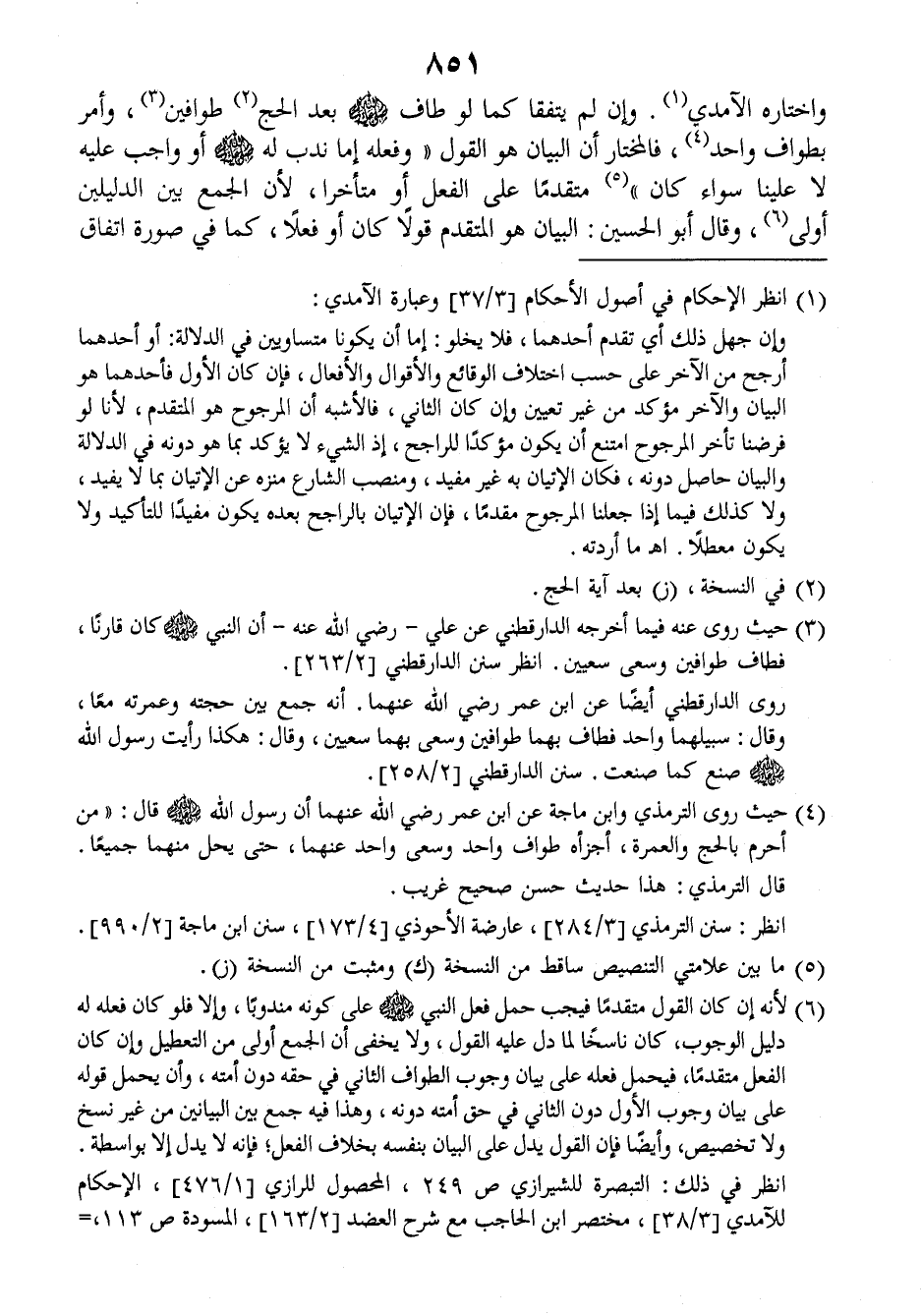 واختاره الآمدي وإن لم يتفقا كما لو طاف صلى الله عليه وسلم بعد الحج طوافين وأمر بطواف واحد فالمختار أن البيان هو القول (وفعله إما ندب له صلى الله عليه وسلم أو واجب عليه لا علينا سواء كان) متقدما على الفعل أو متأخرا، لأن الجمع بين الدليلين أولى وقال أبو الحسين: البيان هو المتقدم قولا كان أو فعلا، كما في صورة اتفاق