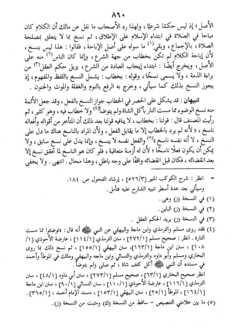 الأصل، إذ ليس حكما شرعيا ولهذا رد الأصحاب ما نقل عن مالك أن الكلام كان مباحا في الصلاة في ابتداء الإسلام على الإطلاق، ثم نسخ بما لا يتعلق بمصلحة الصلاة، بالإجماع وبقي ما سواه على أصل الإباحة، فقالوا: هذا ليس بنسخ، لأن إباحة الكلام لم تكن بخطاب من جهة الشرع، وإنما كان الناس منه على الأصل، ويخرج أيضا: ابتداء إيجاب العبادة من الشرع يزيل حكم العقل من براءة الذمة ولا يسمى نسخا وقوله: بخطاب: يشمل النسخ باللفظ والمفهوم، إذ يجوز النسخ بذلك كما سيأتي وخرج به الرفع بالنوم والغفلة والموت والجنون.