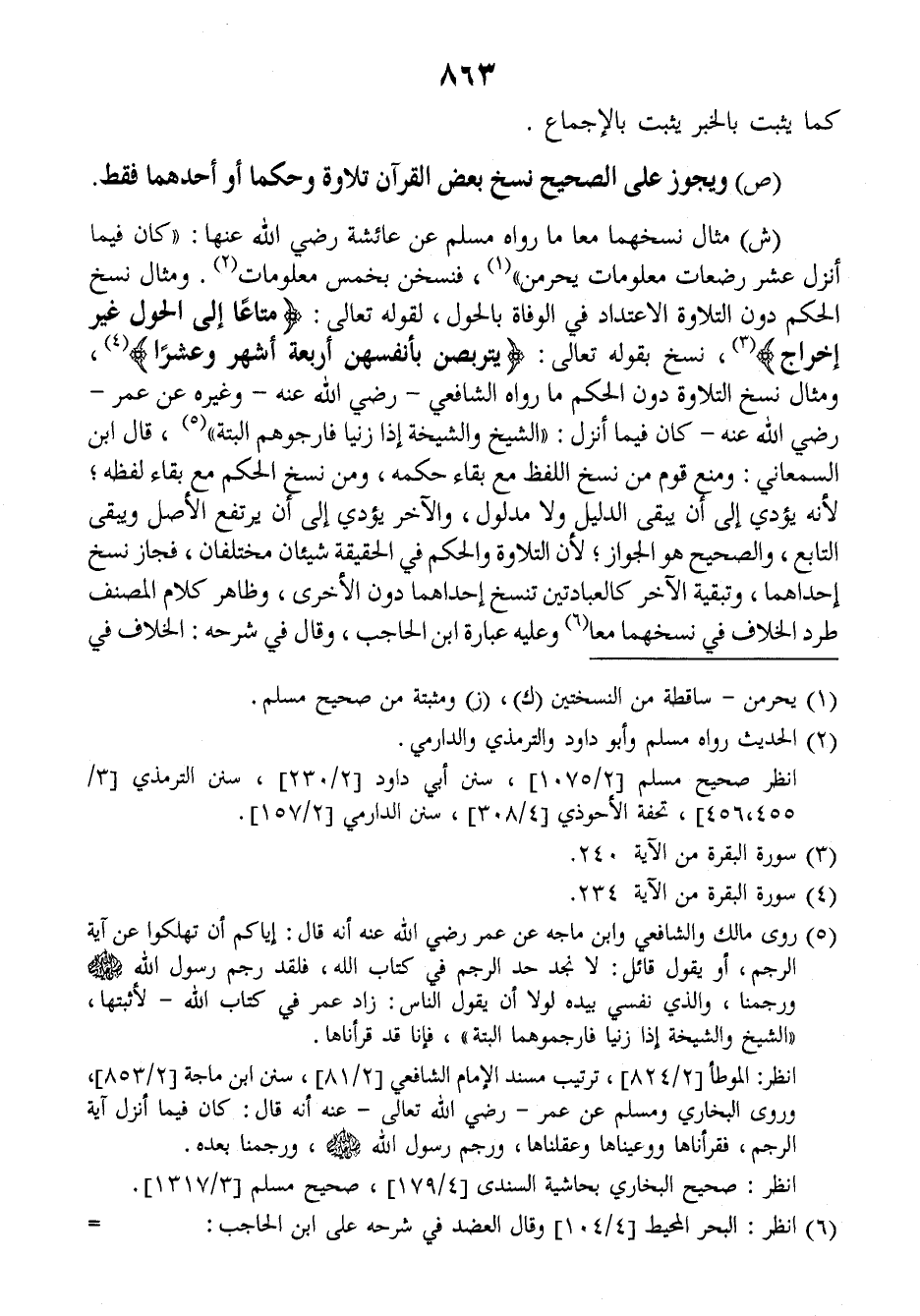 (ش) مثال نسخهما معا ما رواه مسلم عن عائشة رضي الله عنها: (كان فيما أنزل عشر رضعات معلومات يحرمن) فنسخن بخمس معلومات ومثال نسخ الحكم دون التلاوة الاعتداد في الوفاة بالحول، لقوله تعالى: {متاعا إلى الحول غير إخراج} نسخ بقوله تعالى: {يتربصن بأنفسهن أربعة أشهر وعشرا} ومثال نسخ التلاوة دون الحكم ما رواه الشافعي رضي الله عنه، وغيره عن عمر - رضي الله عنه - كان فيما أنزل: (الشيخ والشيخة إذا زنيا فارجموهم البتة) قال ابن السمعاني: ومنع قوم من نسخ اللفظ مع بقاء حكمه، ومن نسخ الحكم مع بقاء لفظه، لأنه يؤدي إلى أن يبقى الدليل ولا مدلول والآخر يؤدي إلى أن يرتفع الأصل ويبقى التابع، والصحيح هو الجواز، لأن التلاوة والحكم في الحقيقة شيئان مختلفان، فجاز نسخ إحداهما وتبقية الآخر كالعبادتين تنسخ إحداهما دون الأخرى، وظاهر كلام المصنف طرد الخلاف في نسخهما معا وعليه عبارة ابن الحاجب وقال في شرحه: الخلاف في