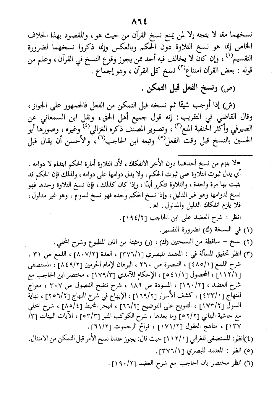 (ش) إذا أوجب شيئا ثم نسخه قبل التمكن من الفعل فالجمهور على الجواز وقال القاضي في (التقريب): إنه قول جميع أهل الحق، ونقل ابن السمعاني عن الصيرفي وأكثر الحنفية المنع، وتصوير المصنف ذكره الغزالي وغيره، وصورها أبو الحسين بالنسخ قبل وقت الفعل، وتبعه ابن الحاجب والأحسن أن يقال قبل