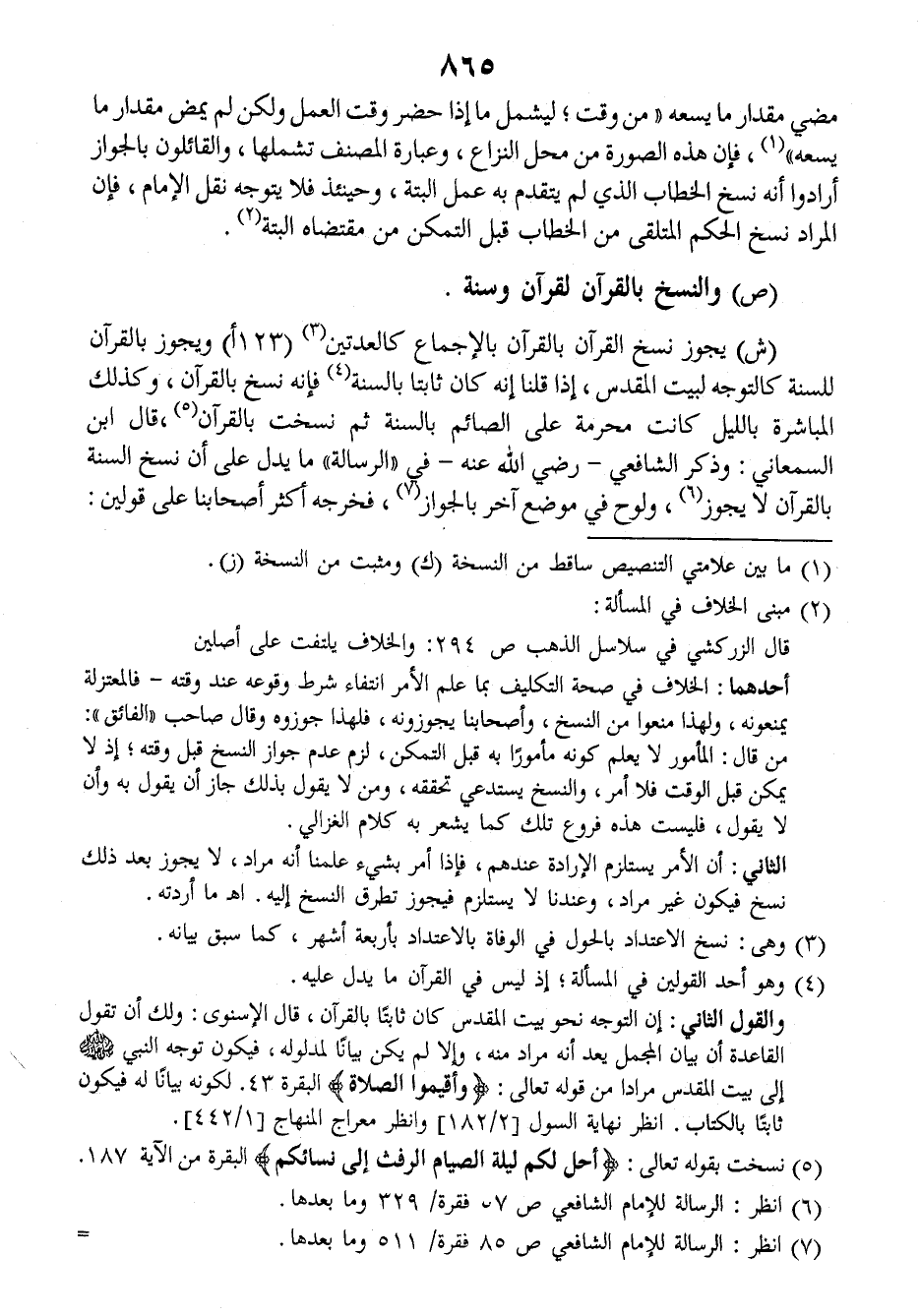 (ش) يجوز نسخ القرآن بالقرآن بالإجماع كالعدتين (١٢٣أ) ويجوز القرآن للسنة كالتوجه لبيت المقدس، إذا قلنا إنه كان ثابتا بالسنة فإنه نسخ بالقرآن، وكذلك المباشرة بالليل كانت محرمة على الصائم بالسنة ثم نسخت بالقرآن قال ابن السمعاني: وذكر الشافعي رضي الله عنه، في (الرسالة) ما يدل على أن نسخ السنة بالقرآن لا يجوز ولوح في موضع آخر بالجواز فخرجه أكثر أصحابنا على قولين: