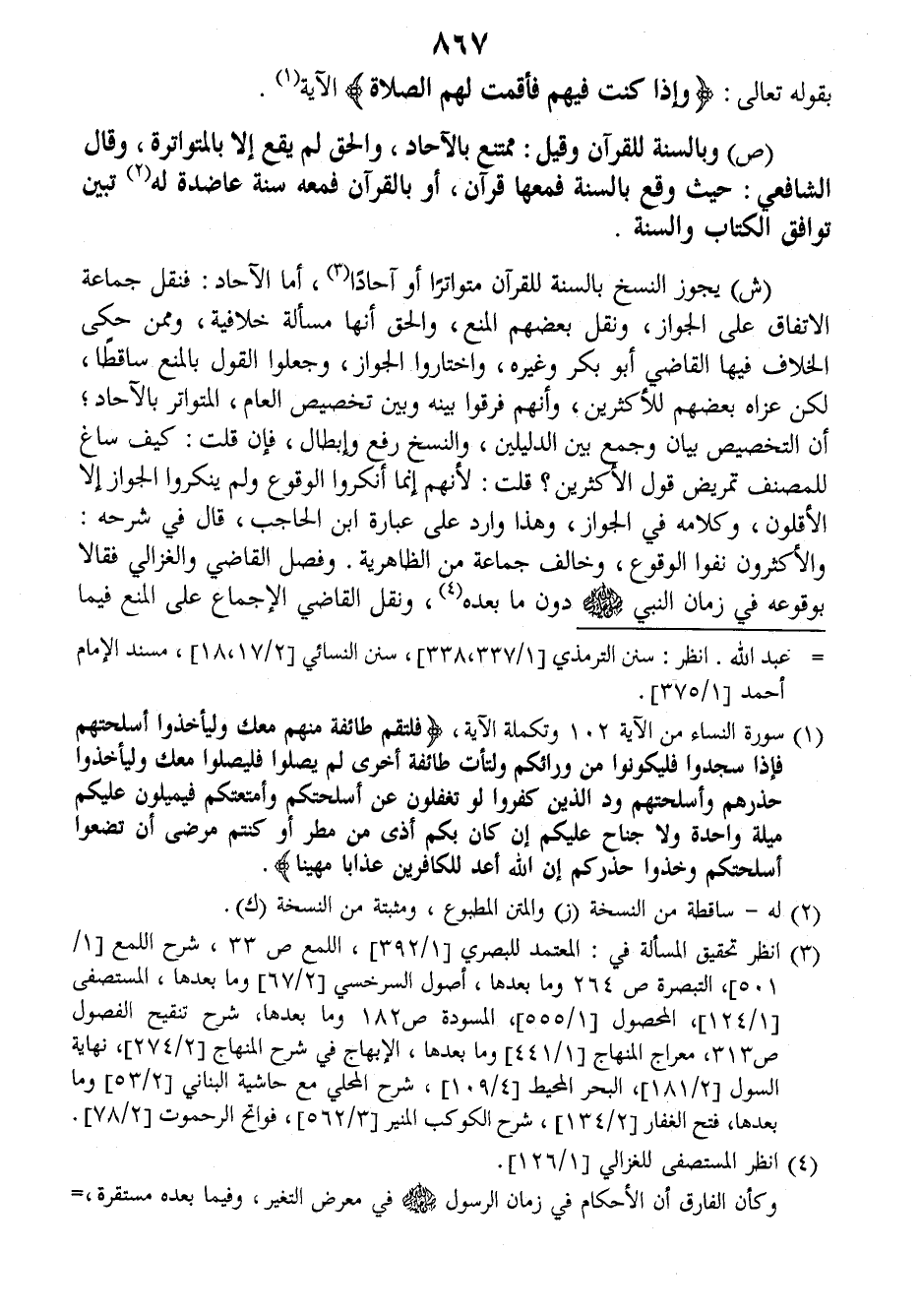 (ش) يجوز النسخ بالسنة للقرآن متواترا أو آحادا أما الآحاد: فنقل جماعة الاتفاق على الجواز، ونقل بعضهم المنع، والحق أنها مسألة خلافية وممن حكى الخلاف فيها القاضي أبو بكر وغيره، واختاروا الجواز، وجعلوا القول بالمنع ساقطا، لكن عزاه بعضهم للأكثرين، وأنهم فرقوا بينه وبين تخصيص العام، المتواتر بالآحاد، أن التخصيص بيان وجمع بين الدليلين والنسخ رفع وإبطال، فإن قلت: كيف ساغ للمصنف تمريض قول الأكثرين؟ قلت: لأنهم إنما أنكروا الوقوع ولم ينكروا الجواز إلا الأقلون، وكلامه في الجواز، وهذا وارد على عبارة ابن الحاجب، قال في شرحه: والأكثرون نفوا الوقوع وخالف جماعة من الظاهرية. وفصل القاضي والغزالي فقالا بوقوعه في زمان النبي صلى الله عليه وسلم دون ما بعده، ونقل القاضي الإجماع على المنع فيما