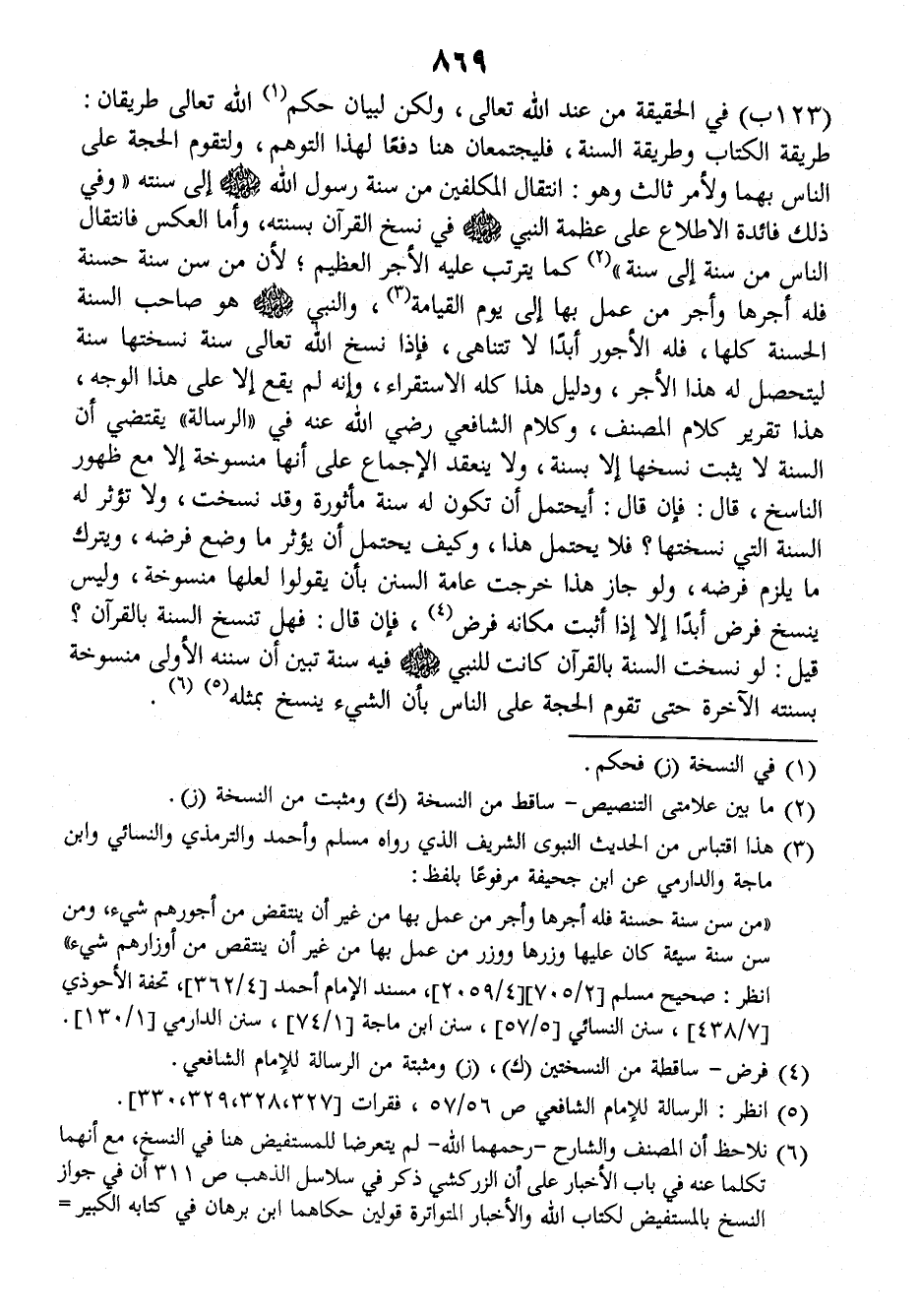 (١٢٣ب) في الحقيقة من عند الله تعالى، ولكن لبيان حكم الله تعالى طريقان: طريقة الكتاب وطريقة السنة، فليجتمعان هنا دفعا لهذا التوهم، ولتقوم الحجة على الناس بهما، ولأمر ثالث وهو: انتقال المكلفين من سنة رسول الله صلى الله عليه وسلم إلى سنته (وفي ذلك فائدة الاطلاع على عظمة النبي صلى الله عليه وسلم في نسخ القرآن بسنته، وأما العكس فانتقال الناس من سنة إلى سنة) كما يترتب عليه الأجر العظيم، لأن من سن سنة حسنة فله أجرها وأجر من عمل بها إلى يوم القيامة، والنبي صلى الله عليه وسلم هو صاحب السنة الحسنة كلها، فله الأجور أبدا لا تتناهى فإذا نسخ الله تعالى سنة نسختها سنة ليتحصل له هذا الأجر، ودليل هذا كله الاستقراء وإنه لم يقع إلا على هذا الوجه، هذا تقرير كلام المصنف، وكلام الشافعي رضي الله عنه في (الرسالة) يقتضي أن السنة لا يثبت نسخها إلا بسنة، ولا ينعقد الإجماع على أنها منسوخة إلا مع ظهور الناسخ، قال: فإن قال: أيحتمل أن تكون له سنة مأثورة وقد نسخت، ولا تؤثر له السنة التي نسختها؟ فلا يحتمل هذا، وكيف يحتمل أن يؤثر ما وضع فرضه، ويترك ما يلزم فرضه، ولو جاز هذا خرجت عامة السنن بأن يقولوا لعلها منسوخة وليس ينسخ فرض أبدا إلا إذا أثبت مكانه فرض فإن قال: فهل تنسخ السنة بالقرآن؟ قيل: لو نسخت السنة بالقرآن كانت للنبي صلى الله عليه وسلم فيه سنة تبين أن سننه الأولى منسوخة بسنته الآخرة حتى