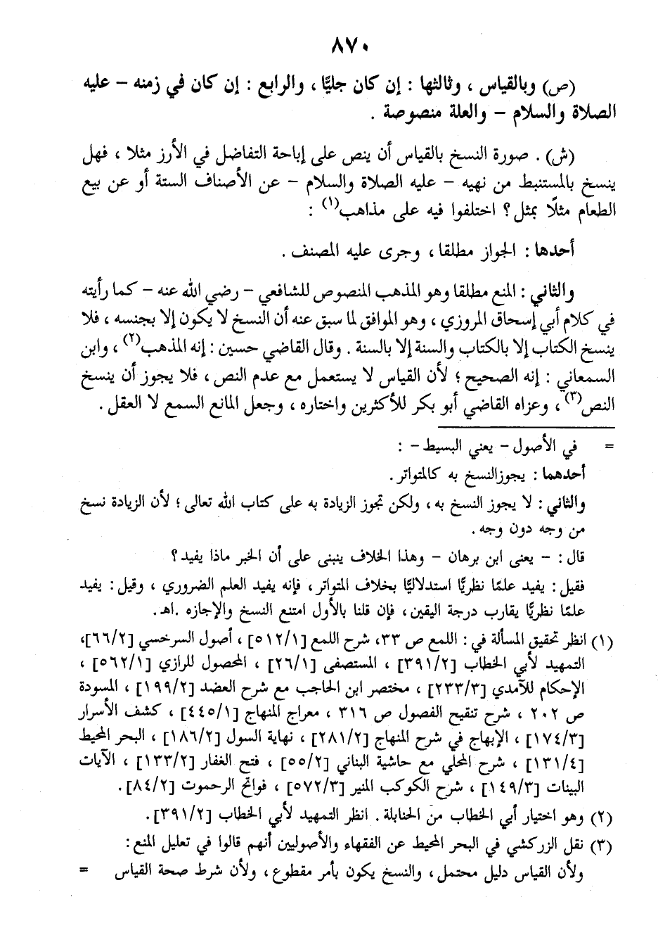 (ش) صورة النسخ بالقياس أن ينص على إباحة التفاضل في الأرز مثلا، فهل ينسخ بالمستنبط من نهيه عليه الصلاة والسلام عن الأصناف الستة أو عن بيع الطعام مثلا بمثل؟ اختلفوا فيه على مذاهب.