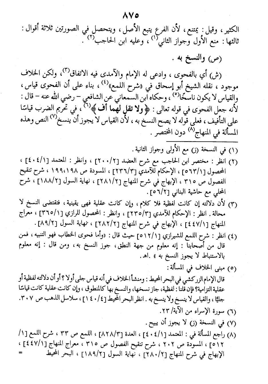 (ش) أي بالفحوى وادعى له الإمام والآمدي فيه الاتفاق ولكن الخلاف موجود، نقله الشيخ أبو إسحاق في (شرح اللمع) بناء على أن الفحوى قياس، والقياس لا يكون ناسخا وحكاه ابن السمعاني عن الشافعي رضي الله عنه، قال: لأنه جعل الفحوى في قوله تعالى: {ولا تقل لهما أف} في تحريم الضرب قياسا على التأفيف فعلى قوله لا يصح النسخ به، لأن القياس لا يجوز أن ينسخ النص وهذه المسألة في المنهاج، دون المختصر.