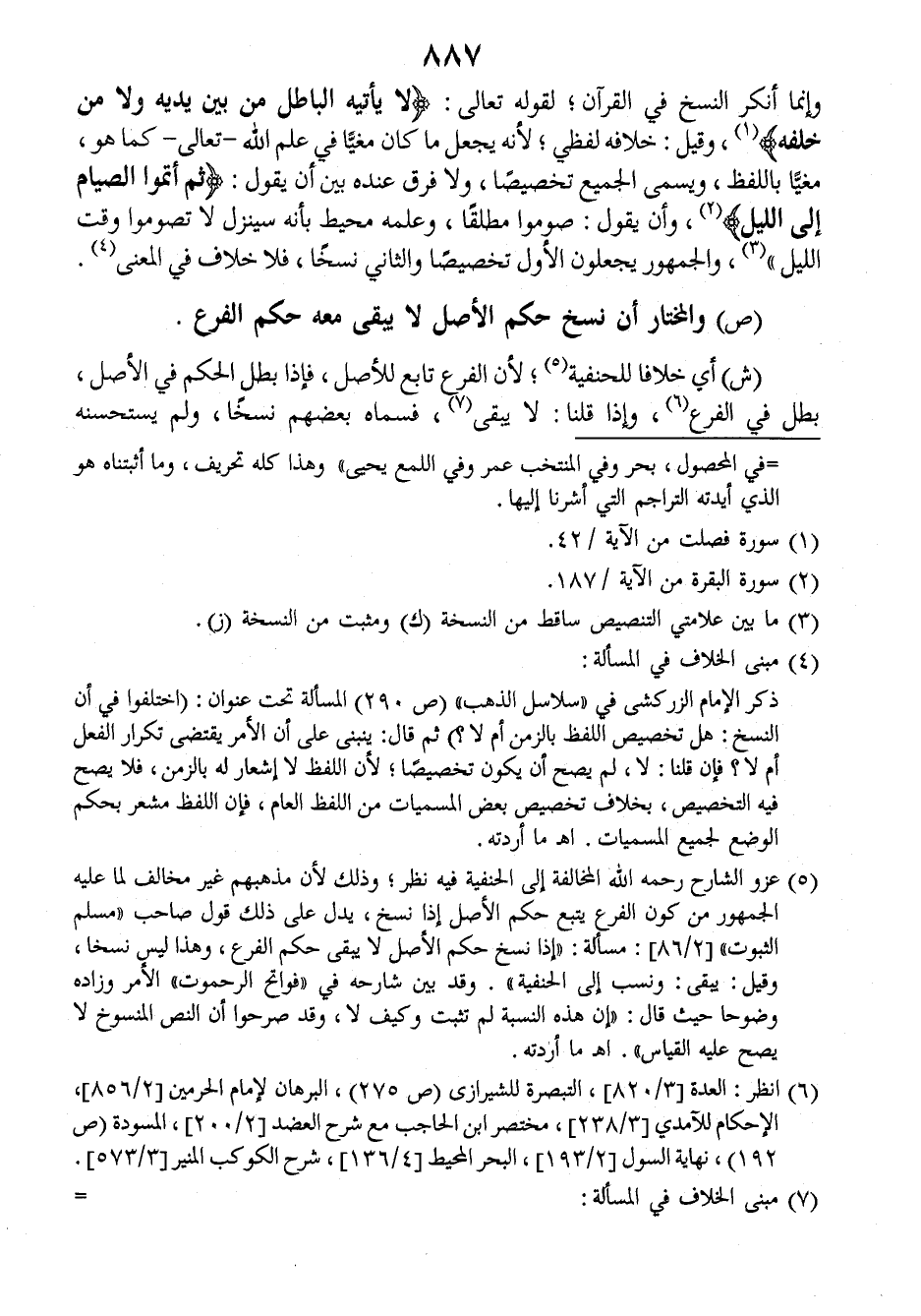 وإنما أنكر النسخ في القرآن، لقوله تعالى: {لا يأتيه الباطل من بين يديه ولا من خلفه} وقيل: خلافه لفظي، لأنه يجعل ما كان مغيا في علم الله - تعالى-، كما هو مغيا باللفظ، ويسمى الجميع تخصيصا، ولا فرق عنده بين أن يقول: {ثم أتموا الصيام إلى الليل} وأن يقول: (صوموا مطلقا، وعلمه محيط بأنه سينزل لا تصوموا وقت الليل) والجمهور يجعلون الأول تخصيصا والثاني نسخا، فلا خلاف في المعنى.