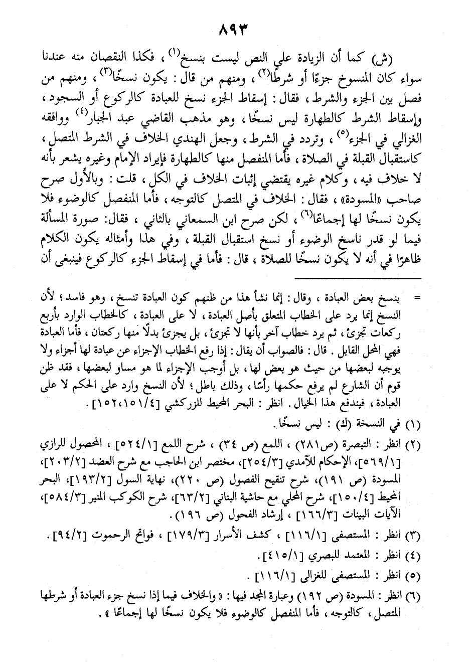(ش) كما أن الزيادة على النص ليست بنسخ فكذا النقصان منه عندنا سواء كان المنسوخ جزءا أو شرطا ومنهم من قال: يكون نسخا ومنهم من فصل بين الجزء والشرط، فقال: إسقاط الجزء نسخ للعبادة كالركوع أو السجود وإسقاط الشرط كالطهارة ليس نسخا، وهو مذهب القاضي عبد الجبار ووافقه الغزالي في الجزء، وتردد في الشرط، وجعل الهندي الخلاف في الشرط المتصل كاستقبال القبلة في الصلاة، فأما المنفصل منها كالطهارة فإيراد إمام وغيره يشعر بأنه لا خلاف فيه، وكلام غيره يقتضي إثبات الخلاف في الكل، قلت: وبالأول صرح صاحب (المسودة) فقال: الخلاف في المتصل كالتوجه، فأما المنفصل كالوضوء فلا يكون نسخا لها إجماعا لكن صرح ابن السمعاني بالثاني، فقال: صورة المسألة فيما لو قدر ناسخ الوضوء أو نسخ استقبال القبلة، وفي هذا وأمثاله يكون الكلام ظاهرا في أنه لا يكون نسخا للصلاة، قال: فأما في إسقاط الجزء كالركوع فينبغي أن