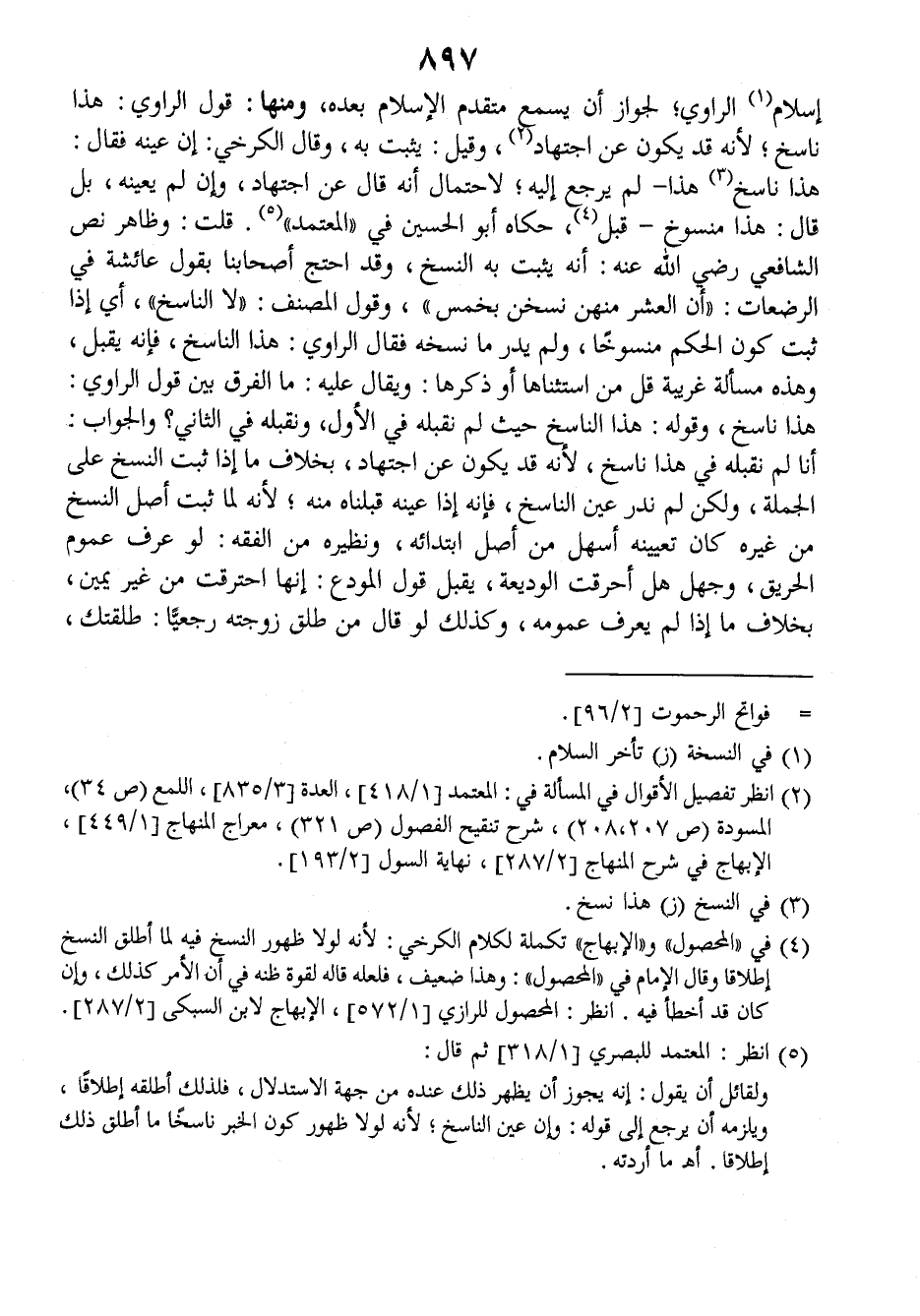 إسلام الراوي لجواز أن يسمع متقدم الإسلام بعده، ومنها: قول الراوي، هذا ناسخ لأنه قد يكون عن اجتهاد وقيل: يثبت به وقال الكرخي: إن عينه فقال: هذا ناسخ هذا - لم يرجع إليه، لاحتمال أنه قال عن اجتهاد، وإن لم يعينه، بل قال: هذا منسوخ - قبل، حكاه أبو الحسين في (المعتمد) قلت: وظاهر نص الشافعي رضي الله عنه: أنه يثبت به النسخ، وقد احتج أصحابنا بقول عائشة في الرضعات: (أن العشر منهن نسخن بخمس) وقول المصنف: (لا الناسخ) أي إذا ثبت كون الحكم منسوخا، ولم يدر ما نسخه فقال الراوي: هذا الناسخ، فإنه يقبل، وهذه مسألة غريبة قل من استثناها أو ذكرها: ويقال عليه: ما الفرق بين قول الراوي: هذا ناسخ، وقوله: هذا الناسخ حيث لم نقبله في الأول، ونقبله في الثاني؟ والجواب: أنا لم نقبله في هذا ناسخ، لأنه قد يكون عن اجتهاد، بخلاف ما إذا ثبت النسخ على الجملة ولكن لم ندر عين الناسخ، فإنه إذا عينه قبلناه منه، لأنه لما ثبت أصل النسخ، من غيره كان تعيينه أسهل من أصل ابتدائه، ونظيره من الفقه: لو عرف عموم الحريق وجهل هل أحرقت الوديعة، يقبل قول المودع: إنها احترقت من غير يمين، بخلاف ما إذا لم يعرف عمومه وكذلك لو قال من طلق زوجته رجعيا: طلقتك