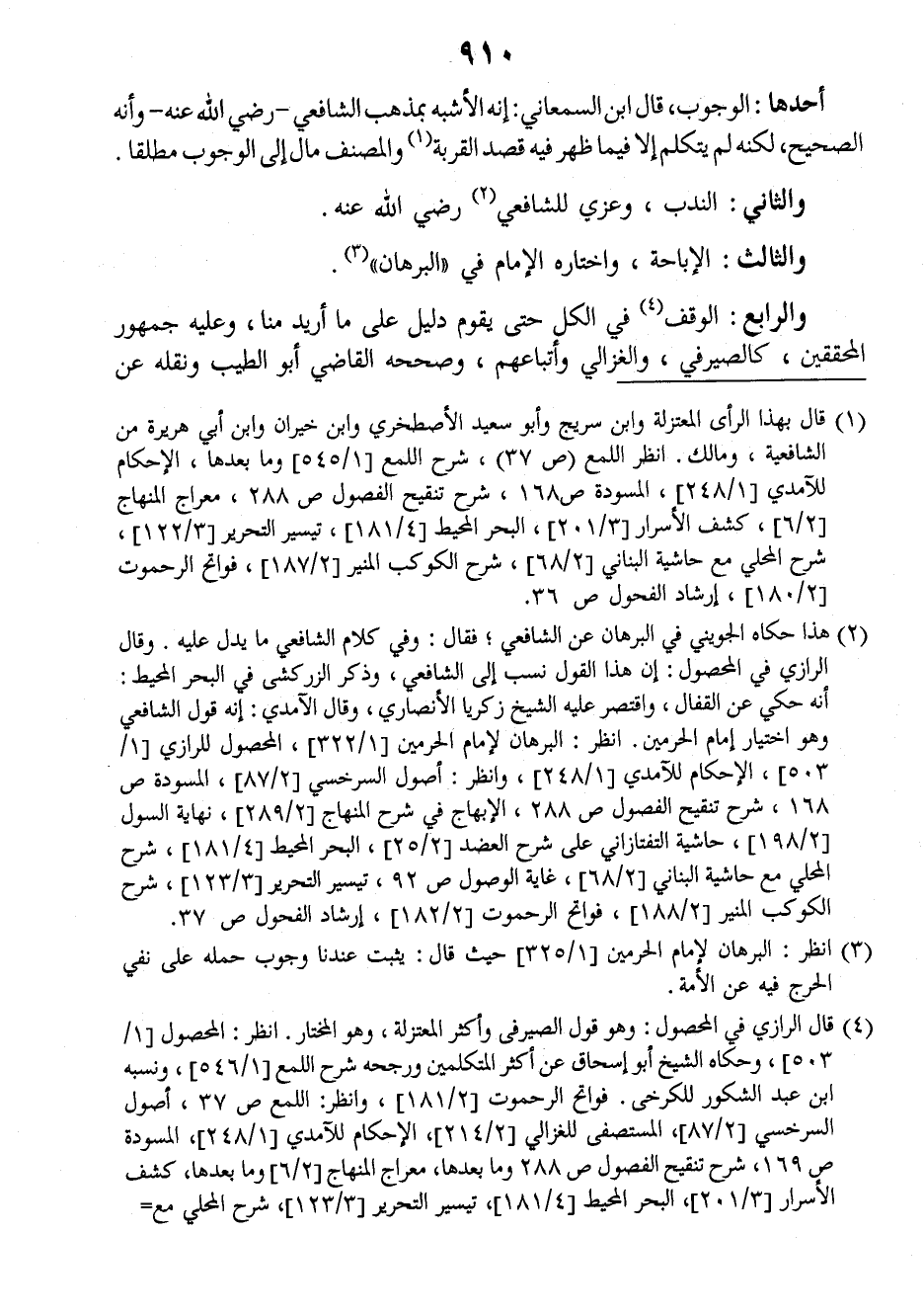 والرابع: الوقف في الكل حتى يقوم دليل على ما أريد منا، وعليه جمهور المحققين، كالصيرفي، والغزالي وأتباعهم، وصححه القاضي أبو الطيب ونقله عن