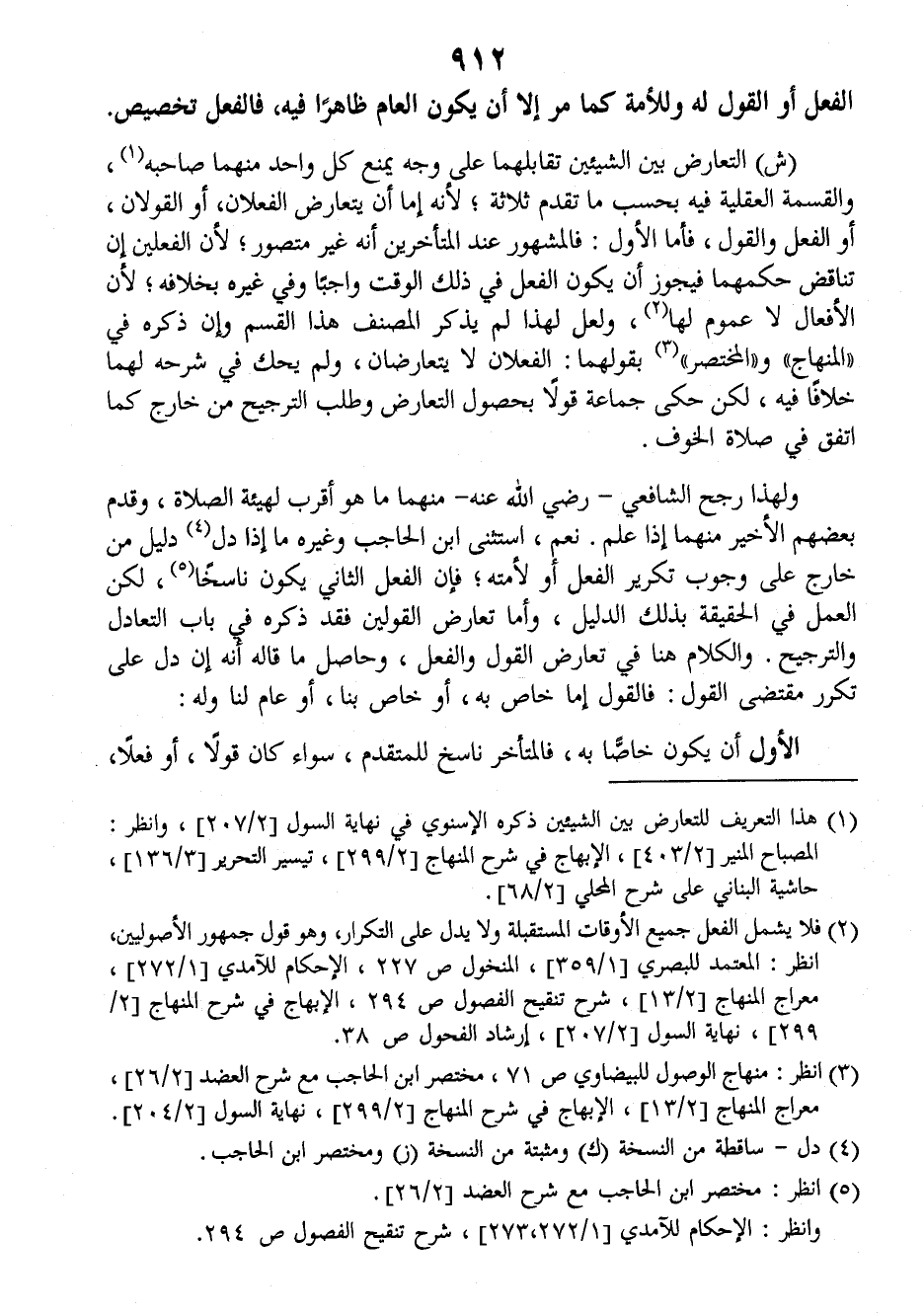 ولهذا رجح الشافعي رضي الله عنه، منهما ما هو أقرب لهيئة الصلاة، وقدم بعضهم الأخير منها إذا علم. نعم، استثنى ابن الحاجب وغيره ما إذا دل دليل من خارج على وجوب تكرير الفعل أو لأمته، فإن الفعل الثاني يكون ناسخاً لكن العمل في الحقيقة بذلك الدليل، وأما تعارض القولين فقد ذكره في باب التعادل والترجيح والكلام هنا في تعارض القول والفعل، وحاصل ما قاله أنه إن دل على تكرر مقتضى القول: فالقول إما خاص به، أو خاص بنا، أو عام لنا وله: