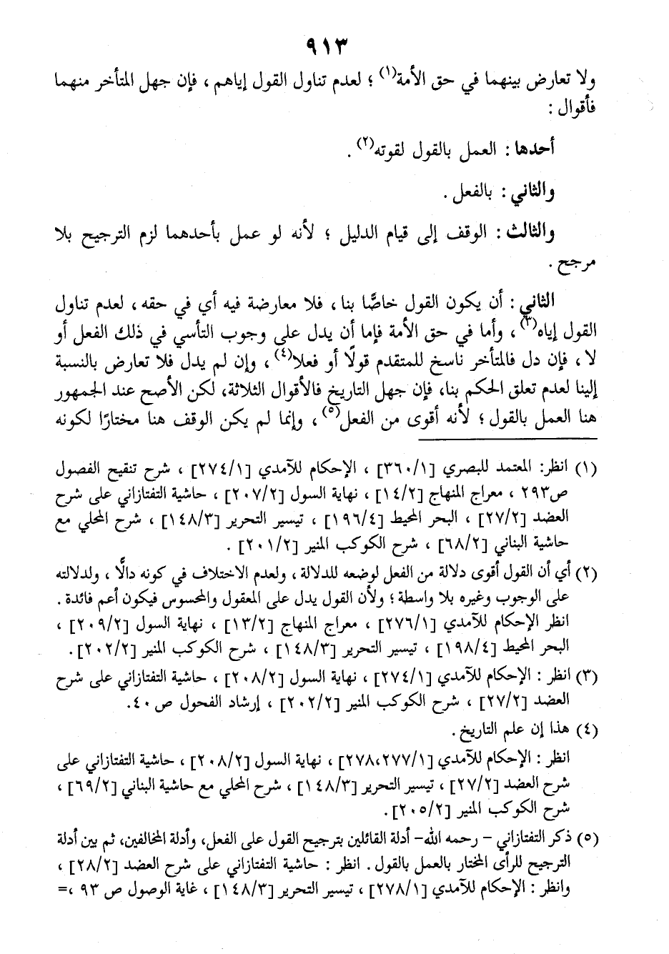 الثاني: أن يكون القول خاصا بنا، فلا معارضة فيه أي في حقه، لعدم تناول القول إياه، وأما في حق الأمة فإما أن يدل على وجوب التأسي في ذلك الفعل أو لا، فإن دل فالمتأخر ناسخ للمتقدم قولا أو فعلا، وإن لم يدل فلا تعارض بالنسبة إلينا لعدم تعلق الحكم بنا، فإن جهل التاريخ فالأقوال الثلاثة، لكن الأصح عند الجمهور هنا العمل بالقول، لأنه أقوى من الفعل، وإنما لم يكن الوقف هنا مختارا لكونه