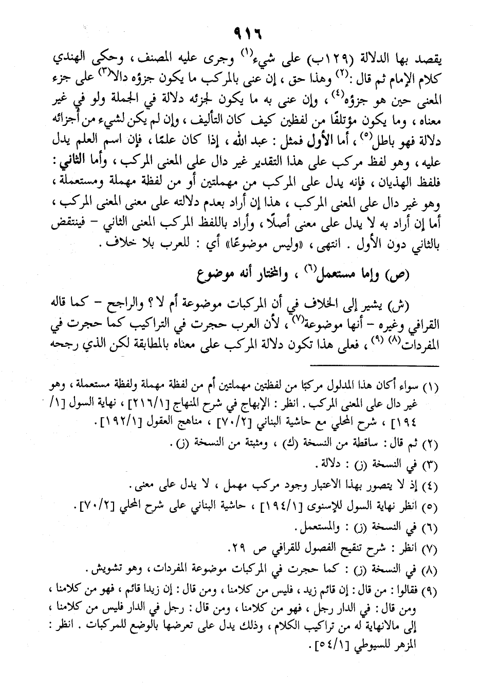 (ش) يشير إلى الخلاف في أن المركبات موضوعة أم لا؟ والراجح - كما قاله القرافي وغيره - أنها موضوعة، لأن العرب حجرت في التراكيب كما حجرت في المفردات، فعلى هذا تكون دلالة المركب على معناه بالمطابقة لكن الذي رجحه