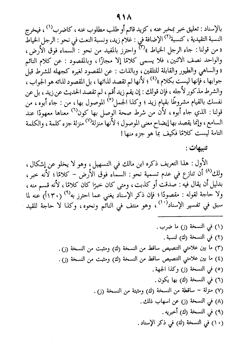 بالإسناد: تعليق خبر بمخبر عنه، كزيد قائم أو طلب مطلوب عنه، كاضرب فيخرج النسبة التقيدية، كنسبة الإضافة في: غلام زيد، ونسبة النعت في نحو: الرجل الخياط (من قولنا: جاء الرجل الخياط) واحترز بالمفيد من نحو: السماء فوق الأرض والواحد نصف الاثنين، فلا يسمى كلاما إلا مجازا، وبالمقصود: عن كلام النائم (والساهي والطيور والقابلة للتلقين، وبالذات: عن المقصود لغيره كجهله للشرط قبل جوابها فإنها ليست بكلام) لأنها لم تقصد لذاتها، بل المقصود لذاته هو الجواب، والشرط مذكور لأجله فإن قولك: إن يقم زيد أقم، لم تقصد الحديث عن زيد، بل عن نفسك بالقيام مشروطا بقيام زيد، وكذا الجمل الموصول بها، من: جاء أبوه، من قولنا: الذي جاء أبوه، لأن من شرط صحة الوصل بها كون معناها معهودا عند السامع، وإنما يقصد بها إيضاح معنى الموصول، لأنها منزلة منزلة جزء كلمة، والكلمة التامة ليست كلاما فكيف بما هو جزء منها؟
