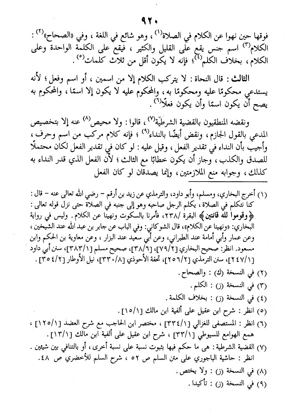 فوقها حين نهوا عن الكلام في الصلاة وهو شائع في اللغة، وفي (الصحاح) الكلام اسم جنس يقع على القليل والكثير، فيقع على الكلمة الواحدة وعلى الكلام بخلاف الكلم فإنه لا يكون أقل من ثلاث كلمات.