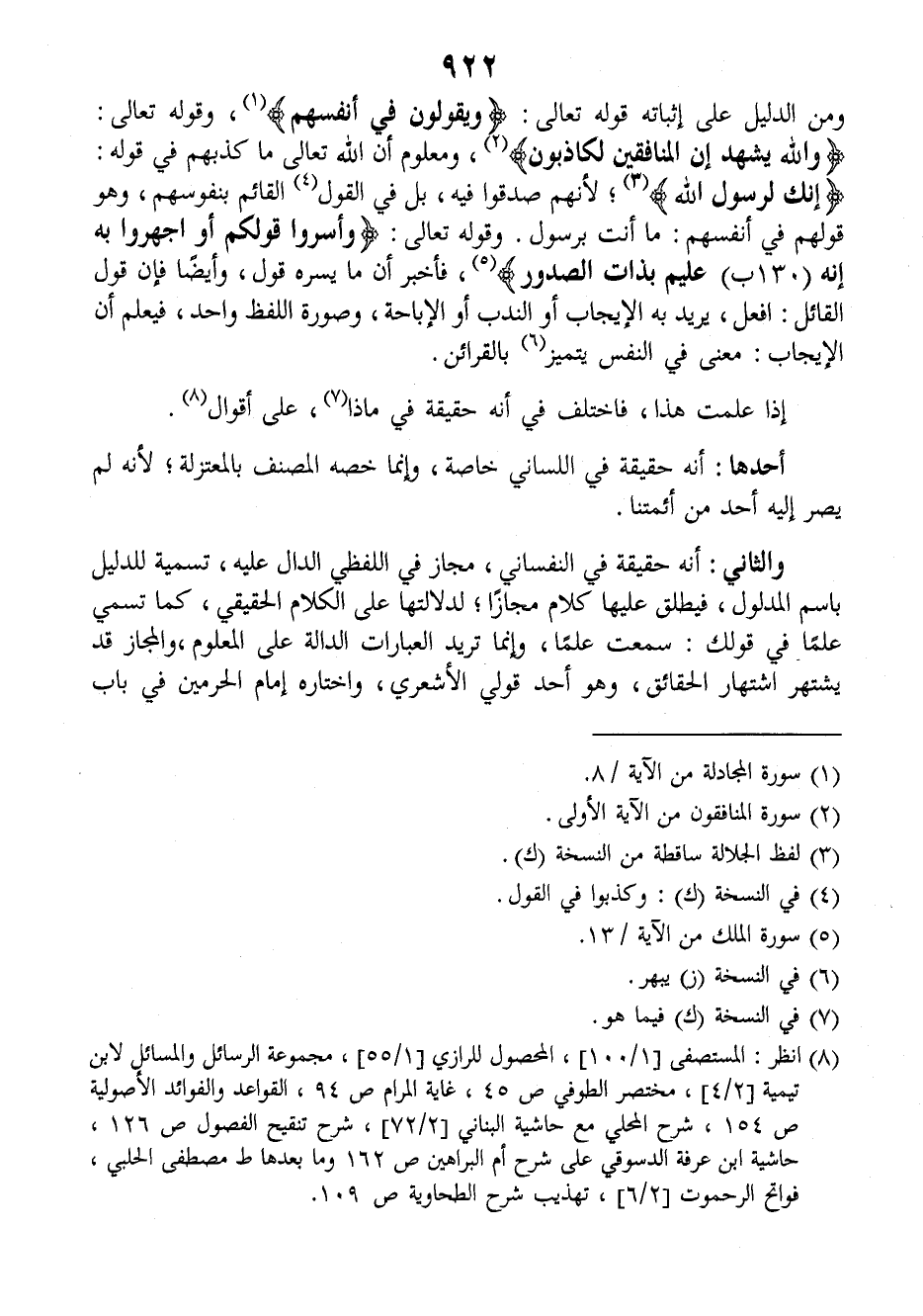 ومن الدليل على إثباته قوله تعالى: {ويقولون في أنفسهم} وقوله تعالى: {والله يشهد إن المنافقين لكاذبون} ومعلوم أن الله تعالى ما كذبهم في قوله: {إنك لرسول الله} لأنهم صدقوا فيه، بل في القول القائم بنفوسهم وهو قولهم في أنفسهم: ما أنت برسول. وقوله تعالى: {وأسروا قولكم أو اجهروا به إنه (١٣٠ب) عليم بذات الصدور} فأخبر أن ما يسره قول، وأيضا فإن قول القائل: افعل، يريد به الإيجاب أو الندب أو الإباحة، وصورة اللفظ واحد، فيعلم أن الإيجاب: معنى في النفس يتميز بالقرائن.