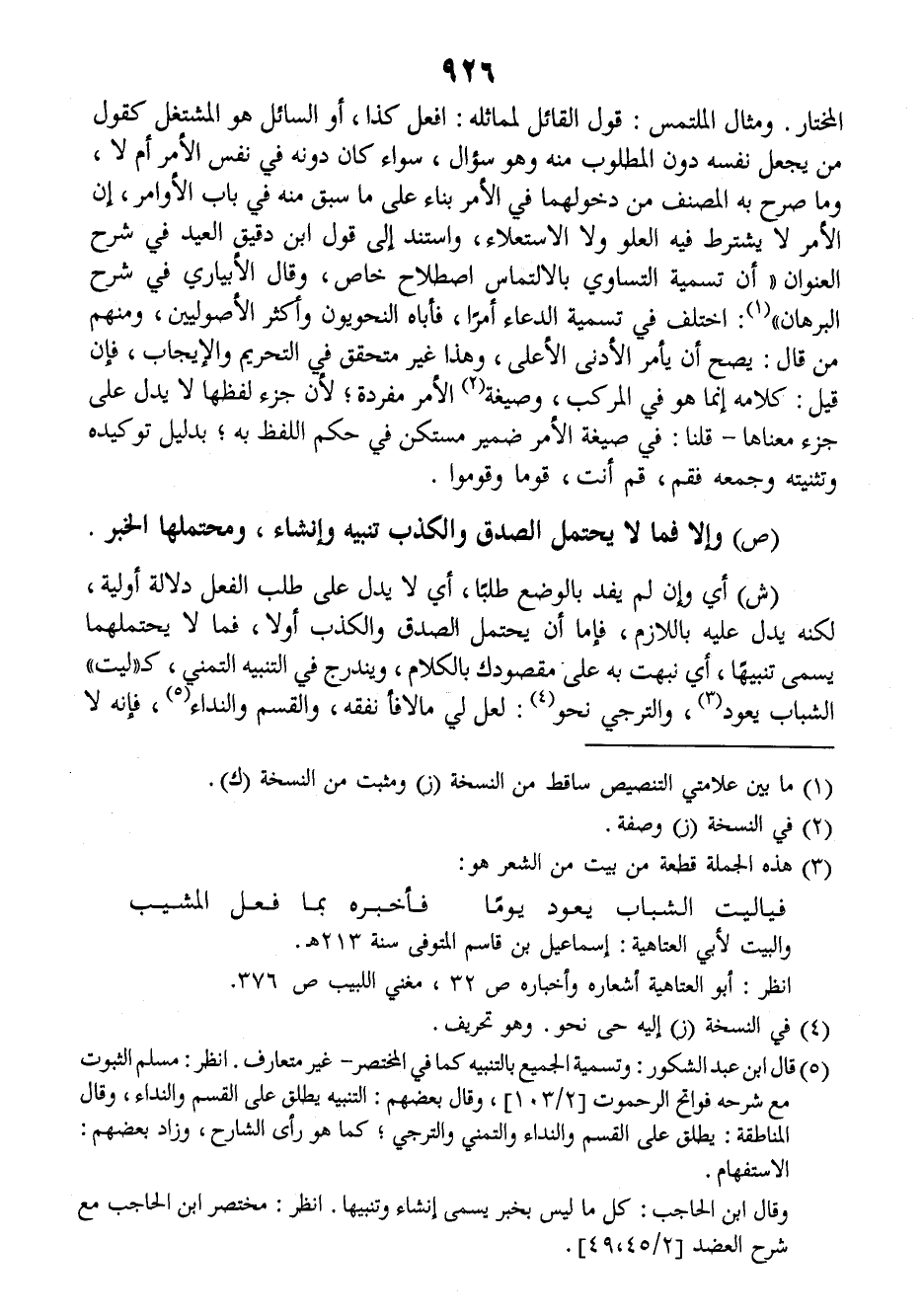 (ش) أي وإن لم يفد بالوضع طلبا، أي لا يدل على طلب الفعل دلالة أولية، لكنه يدل عليه باللازم، فإما أن يحتمل الصدق والكذب أولا، فما لا يحتملها يسمى تنبيها، أي نبهت به على مقصودك بالكلام، ويندرج في التنبيه التمني، كـ (ليت) الشباب يعود والترجي نحو: لعل لي مالا فأنفقه، والقسم والنداء فإنه لا