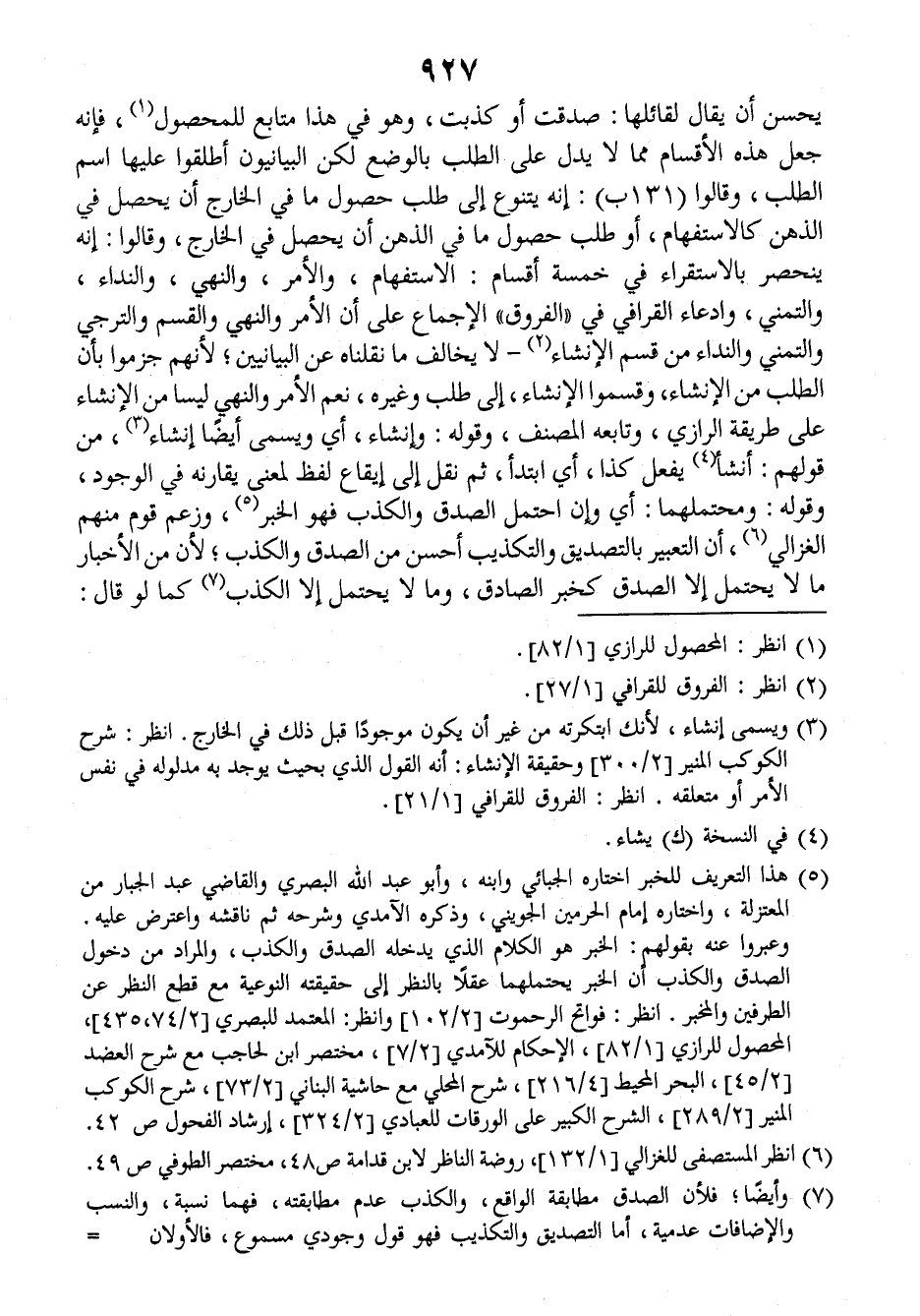 يحسن أن يقال لقائلها: صدقت أو كذبت، وهو في هذا متابع للمحصول فإنه جعل هذه الأقسام مما لا يدل على الطلب بالوضع لكن البيانيون أطلقوا عليها اسم الطلب وقالوا (١٣١ب): إنه يتنوع إلى طلب حصول ما في الخارج أن يحصل في الذهن كالاستفهام أو طلب حصول ما في الذهن أن يحصل في الخارج، وقالوا: إنه ينحصر بالاستقراء في خمسة أقسام: الاستفهام والأمر، والنهي، والنداء، والتمني، وادعاء القرافي في (الفروق) الإجماع على أن الأمر والنهي والقسم والترجي والتمني والنداء من قسم الإنشاء - لا يخالف ما نقلناه عن البيانيين، لأنهم جزموا بأن الطلب من الإنشاء، وقسموا الإنشاء إلى طلب وغيره نعم الأمر والنهي ليسا من الإنشاء على طريقة الرازي، وتابعه المصنف، وقوله: وإنشاء أي ويسمى أيضا إنشاء من قولهم: أنشأ يفعل كذا، أي ابتدأ ثم نقل إلى إيقاع لفظ لمعنى يقارنه في الوجود، وقوله: ومحتملهما: أي وإن احتمل الصدق والكذب فهو الخبر، وزعم قوم منهم الغزالي أن التعبير بالتصديق والتكذيب أحسن من الصدق والكذب، لأن من الأخبار ما لا يحتمل إلا الصدق كخبر الصادق، وما لا يحتمل إلا الكذب، كما لو قال: