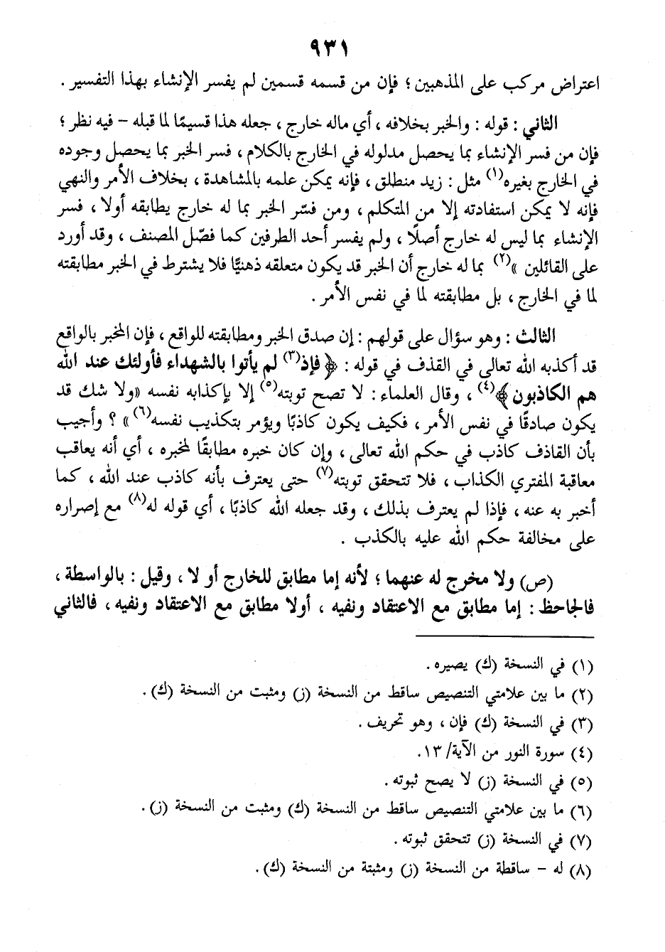 الثالث: وهو سؤال على قولهم: إن صدق الخبر ومطابقته للواقع فإن المخبر بالواقع قد أكذبه الله تعالى في القذف في قوله: {فإذ لم يأتوا بالشهداء فأولئك عند الله هم الكاذبون} وقال العلماء: لا تصح توبته إلا بإكذابه نفسه (ولا شك قد يكون صادقا في نفس الأمر، فكيف يكون كاذبا ويؤمر بتكذيب نفسه)؟ وأجيب بأن القاذف كاذب في حكم الله تعالى، وإن كان خبره مطابقا لمخبره، أي أنه يعاقب معاقبة المفتري الكذاب، فلا تتحقق توبته حتى يعترف بأنه كاذب عند الله، كما أخبر به عنه، فإذا لم يعترف بذلك وقد جعله الله كاذبا، أي قوله له، مع إصراره على مخالفة حكم الله عليه بالكذب.