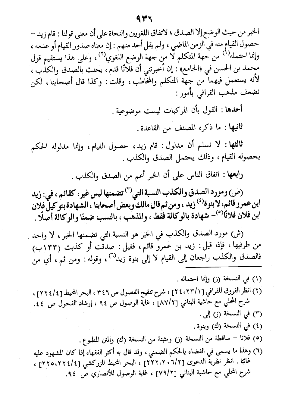(ص) ومورد الصدق والكذب النسبة التي تضمنها ليس غير كقائم، في: زيد ابن عمرو قائم، لا بنوة زيد، ومن ثم قال مالك وبعض أصحابنا الشهادة بتوكيل فلان ابن فلان فلانا - شهادة بالوكالة فقط، والمذهب، بالنسب ضمنا والوكالة أصلا.