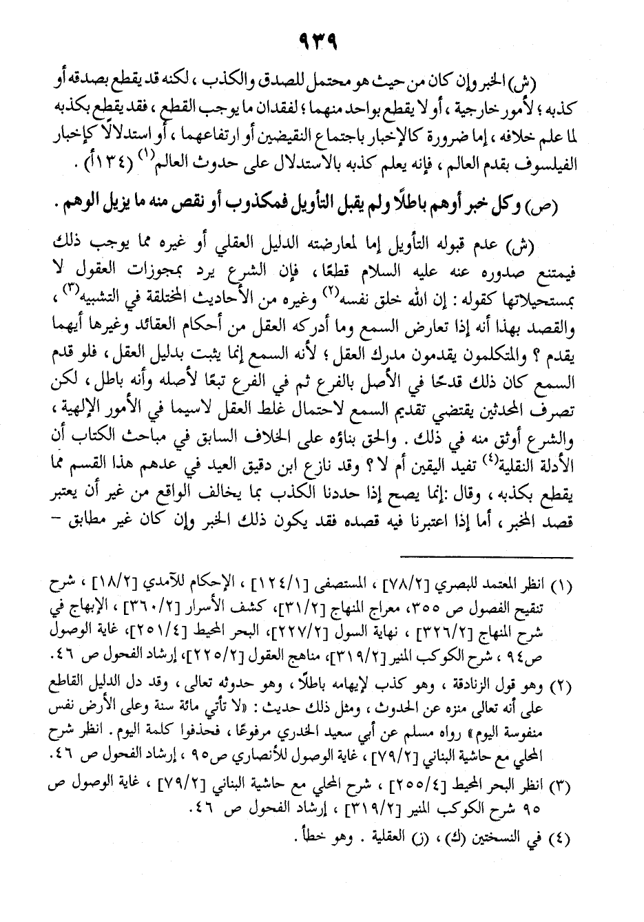 (ش) الخبر وإن كان من حيث هو محتمل للصدق والكذب، لكنه قد يقطع بصدقه أو كذبه لأمور خارجية أو لا يقطع بواحد منهما، لفقدان ما يوجب القطع، فقد يقطع بكذبه لما علم بخلافه، إما ضرورة كالإخبار باجتماع النقيضين أو ارتفاعهما أو استدلالا كإخبار الفيلسوف بقدم العالم فإنه يعلم كذبه بالاستدلال على حدوث العالم. (١٣٤أ).