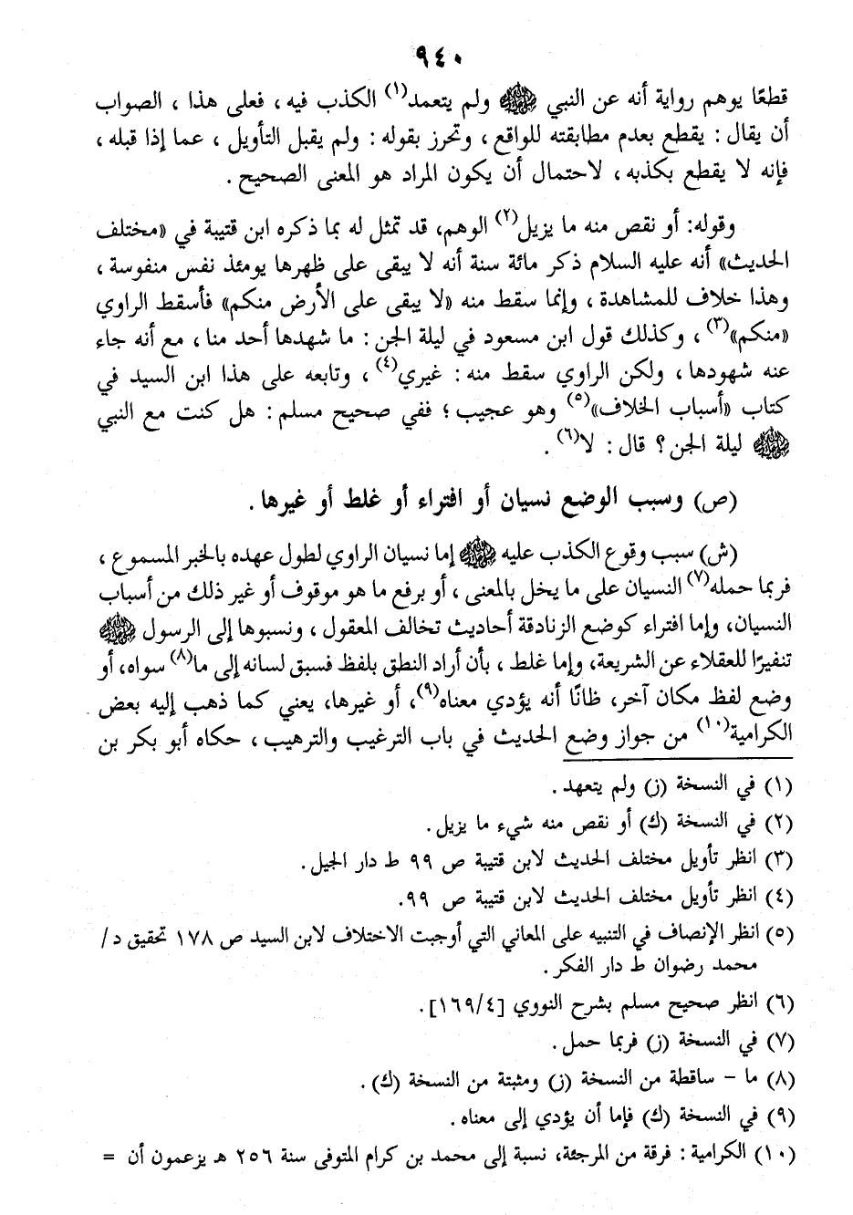 (ش) سبب وقوع الكذب عليه صلى الله عليه وسلم إما نسيان الراوي لطول عهده بالخبر المسموع فربما حمله النسيان على ما يخل بالمعنى، أو برفع ما هو موقوف أو غير ذلك من أسباب النسيان، وما افتراء كوضع الزنادقة أحاديث تخالف المعقول، ونسبوها إلى الرسول صلى الله عليه وسلم تنفيرا للعقلاء عن الشريعة، وإما غلط، بأن أراد النطق بلفظ فسبق لسانه إلى ما سواه، أو وضع لفظ مكان آخر، ظانا أنه يؤدي معناه أو غيرها، يعني كما ذهب إليه بعض الكرامية من جواز وضع الحديث في باب الترغيب والترهيب، حكاه أبو بكر بن