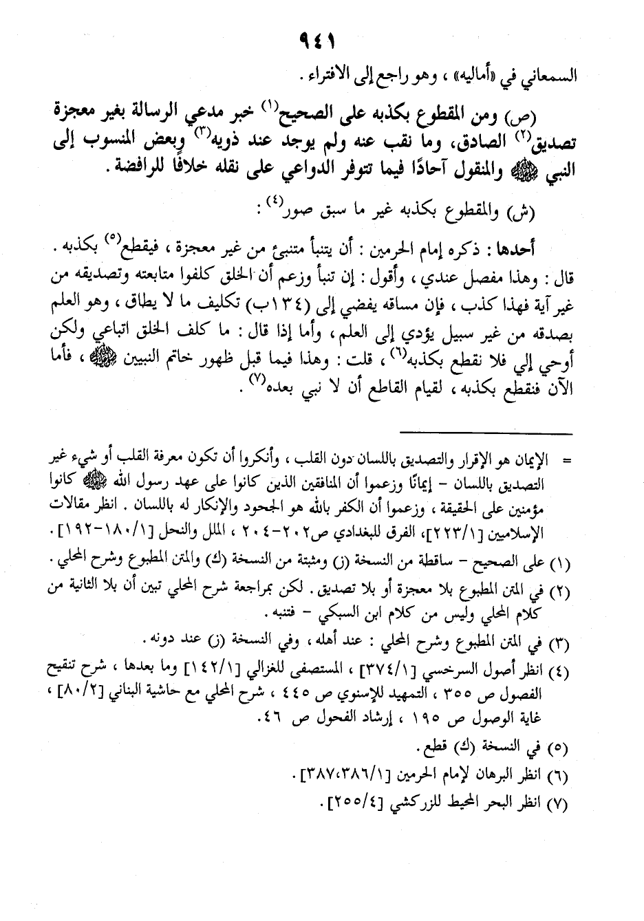 أحدها: ذكره إمام الحرمين: أن يتنبأ متنبئ من غير معجزة فيقطع بكذبه قال: وهذا مفصل عندي، وأقول: إن تنبأ وزعم أن الخلق كلفوا متابعته وتصديقه من غير آية فهذا كذب، فإن مساقه يفضي إلى (١٣٤ب) تكليف ما لا يطاق, وهو العلم بصدقه من غير سبيل يؤدي إلى العلم, وأما إذا قال: ما كلف الخلق اتباعي ولكن أوحي إلي فلا نقطع بكذبه، قلت: وهذا فيما قبل ظهور خاتم النبيين صلى الله عليه وسلم فأما الآن فنقطع بكذبه لقيام القاطع أن لا نبي بعده.