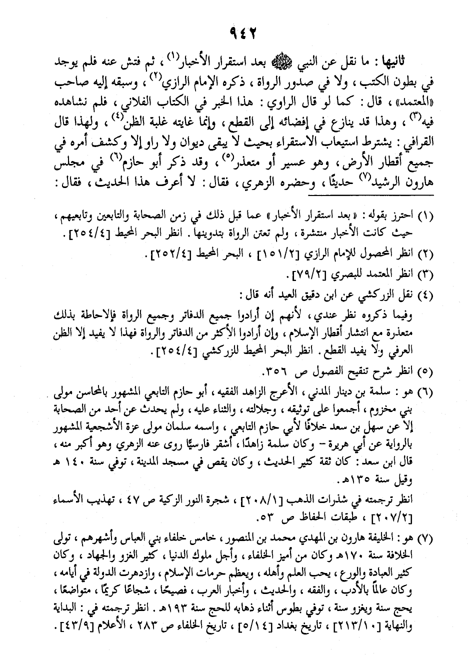 ثانيها: ما نقل عن النبي صلى الله عليه وسلم بعد استقرار الأخبار، ثم فتش عنه فلم يوجد في بطون الكتب، ولا في صدور الرواة، ذكره الإمام الرازي وسبقه إليه صاحب (المعتمد) قال: كما لو قال الراوي: هذا الخبر في الكتاب الفلاني فلم نشاهده فيه وهذا قد ينازع في إفضائه إلى القطع، وإنما غايته غلبة الظن ولهذا قال القرافي: يشترط استيعاب الاستقراء بحيث لا يبقى ديوان ولا راو إلا وكشف أمره في جميع أقطار الأرض، وهو عسير أو متعذر، وقد ذكر أبو حازم، في مجلس هارون الرشيد حديثا، وحضره الزهري، فقال: لا أعرف هذا الحديث فقال: