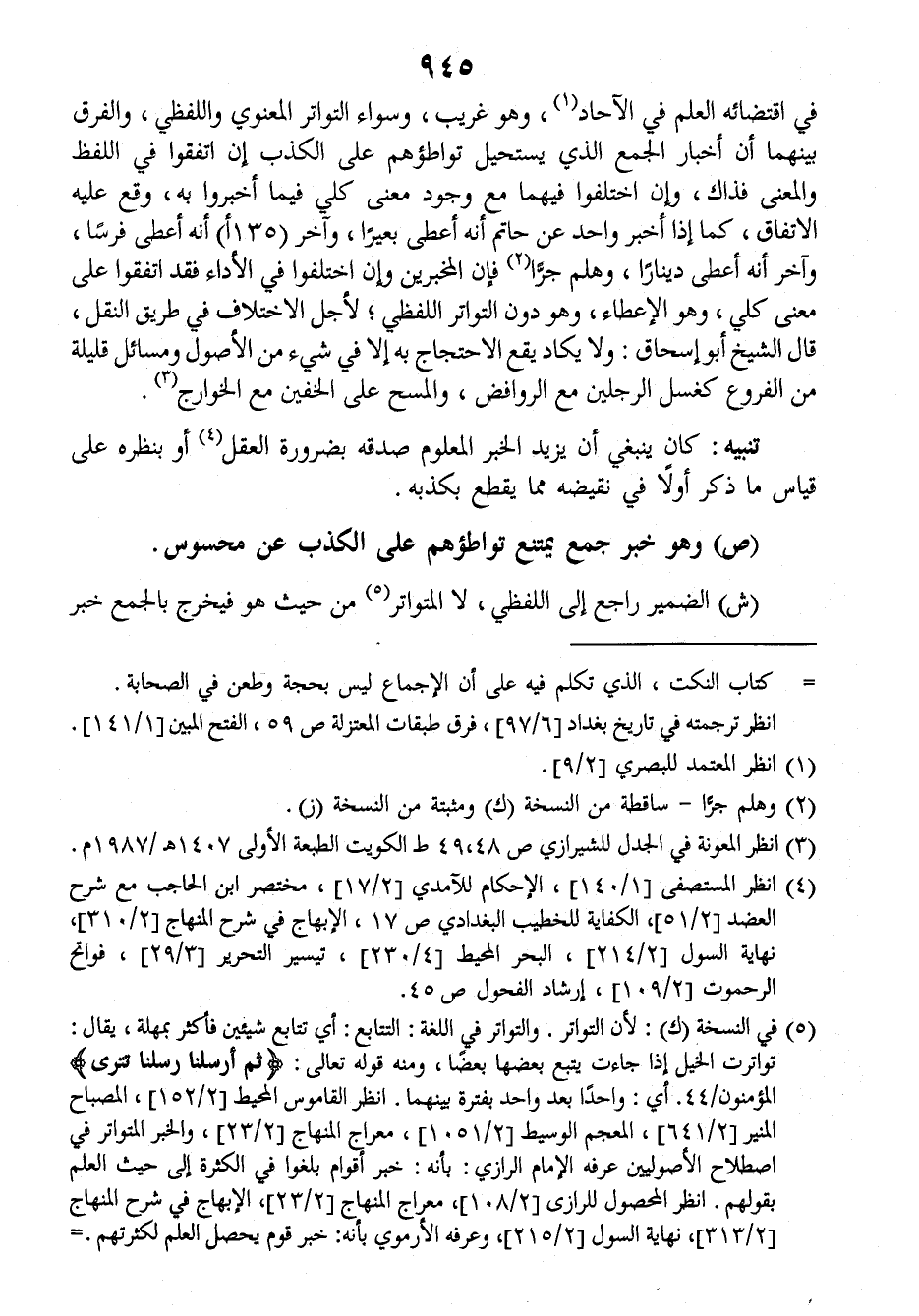 في اقتضائه العلم في الآحاد، وهو غريب، وسواء التواتر المعنوي واللفظي والفرق بينهما أن أخبار الجمع الذي يستحيل تواطؤهم على الكذب إن اتفقوا في اللفظ والمعنى فذاك، وإن اختلفوا فيهما مع وجود معنى كلي فيما أخبروا به، وقع عليه الاتفاق كما إذا أخبر واحد عن حاتم أنه أعطى بعيرا وآخر (١٣٥أ) أنه أعطى فرسا وآخر أنه أعطى دينارا وهلم جرا فإن المخبرين وإن اختلفوا في الأداء فقد اتفقوا على معنى كلي، وهو الإعطاء وهو دون التواتر اللفظي، لأجل الاختلاف في طريق النقل، قال الشيخ أبو إسحاق: ولا يكاد يقع الاحتجاج به إلا في شيء من الأصول ومسائل قليلة من الفروع كغسل الرجلين مع الروافض والمسح على الخفين مع الخوارج.